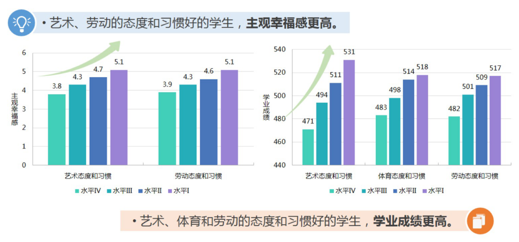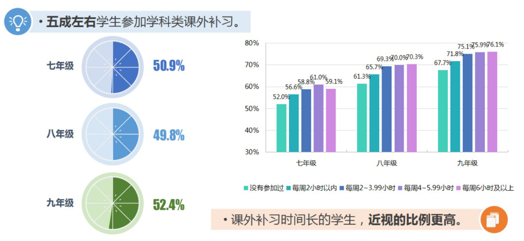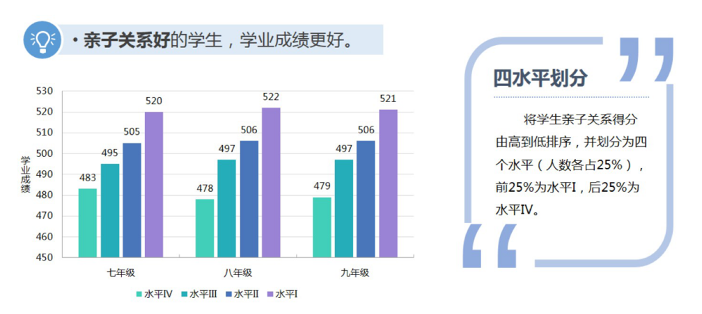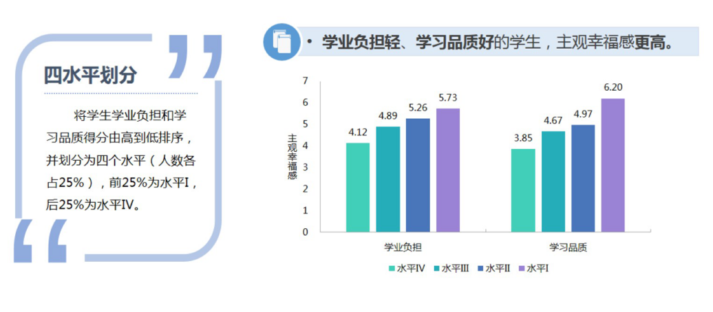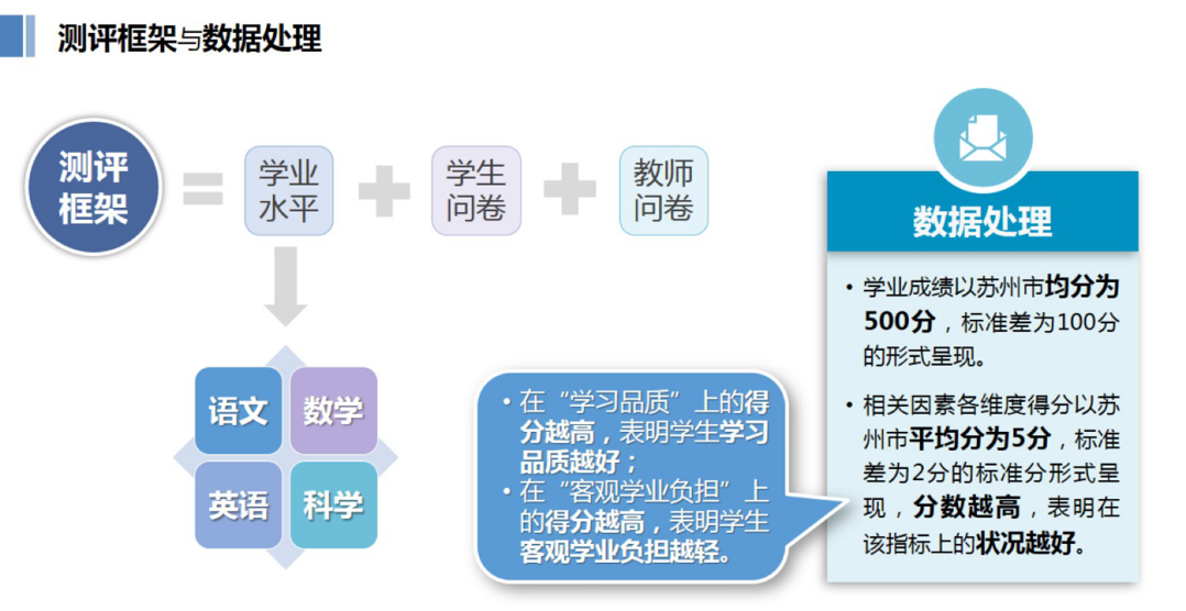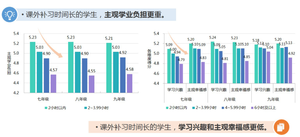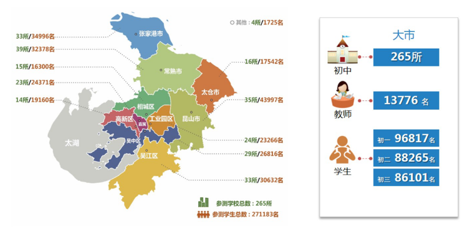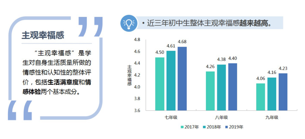 2019年度苏州市义务教育学业质量监测报告 今天,苏州市教育质量监测中心向社会发布2019年度苏州市义务教育学业质量监测报告。 本次报告的监测对象为苏州市辖10个市(区)所有初中学生和部分初中教师,共计参测学校265所。 《报告》主要监测结果包含 心理健康、家庭教育、电子设备使用 体美劳教育、课外补习、压力感受等 六方面内容 以高信度、高效度的大数据测量, 用实证数据实现了对教育经验的有效验证, 并不断揭示教育经验背后的教育规律。 心理健康 ▲近三年学生整体主观幸福感越来越高 家庭教育 监测数据显示,2019年七年级、八年级和九年级每天都吃早餐的学生比例分别为77.6%、69.0%和66.2%,约三成学生不能做到每天都吃早餐,与2018年的监测结果基本一致。从三个年级的比较来看,随着年级的升高,每天吃早餐的人数比例逐渐降低。 监测数据显示,每周吃早餐的天数与学生的学业成绩呈明显正相关,每天都吃早餐的学生学业成绩为508分,而从不或极少吃早餐的学生学业成绩为441分,两者相差67分。进一步分析学生的早餐方式(排除住校生),可以发现,“家人每天在家做给我吃”的学生学业成绩最好,为513分,而“基本不吃早餐”的学生学业成绩最差,为446分。 电子设备使用 监测数据显示,家长在孩子面前“从不使用”智能手机,孩子每周使用智能手机时间为2.22小时,家长在孩子面前手机“几乎从不离手”,孩子每周使用智能手机时间为5.36小时,两者相差3.14小时。 体美劳教育 ▲近八成学生有一项及以上的艺术爱好或特长 ▲超过93%的初中学生有一项及以上的体育爱好或特长 ▲近七成学生经常或总是在家中做家务 ▲艺术、劳动的态度和习惯好的学生,主观幸福感更高 课外补习 ▲五成左右学生参加学科类课外补习 ▲课外补习时间长的学生,主观学业负担更重 压力感受 ▲学业成绩好的学生“自我要求”压力感受较重,“学校及老师要求”压力感受最轻