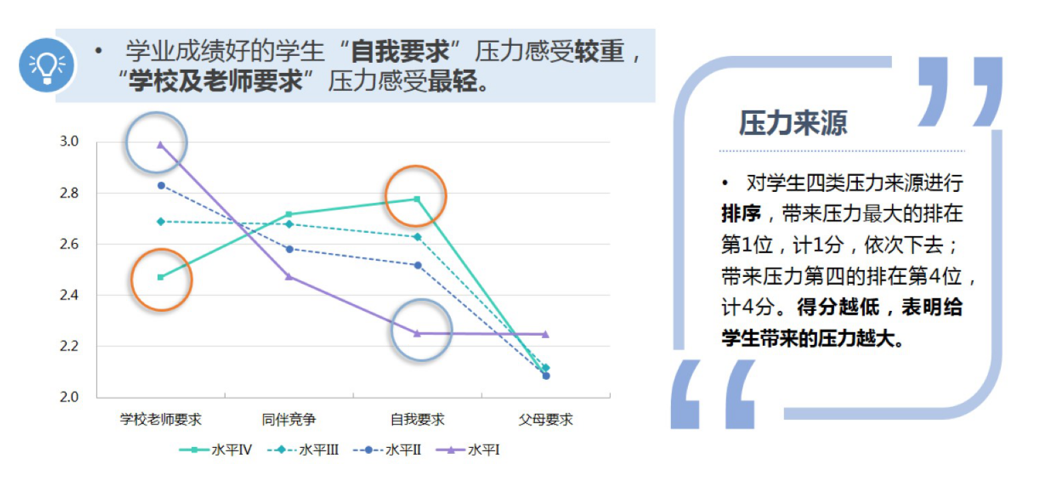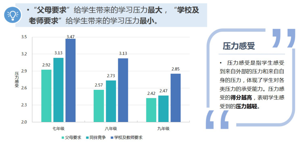 ▲“父母要求”给学生带来的学习压力最大,“学校及老师要求”给学生带来的学习压力最小