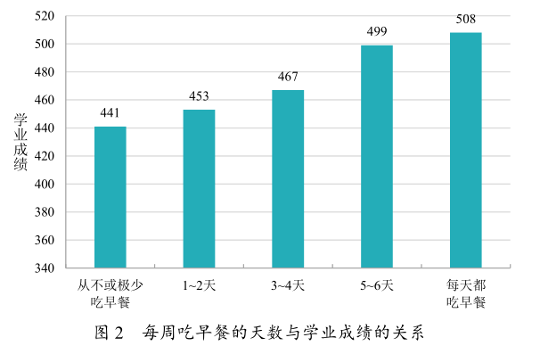 监测数据显示,每周吃早餐的天数与学生的学业成绩呈明显正相关,每天都吃早餐的学生学业成绩为508分,而从不或极少吃早餐的学生学业成绩为441分,两者相差67分(见图2)。进一步分析学生的早餐方式(排除住校生),可以发现,“家人每天在家做给我吃”的学生学业成绩最好,为513分,而“基本不吃早餐”的学生学业成绩最差,为446分(见图3)。