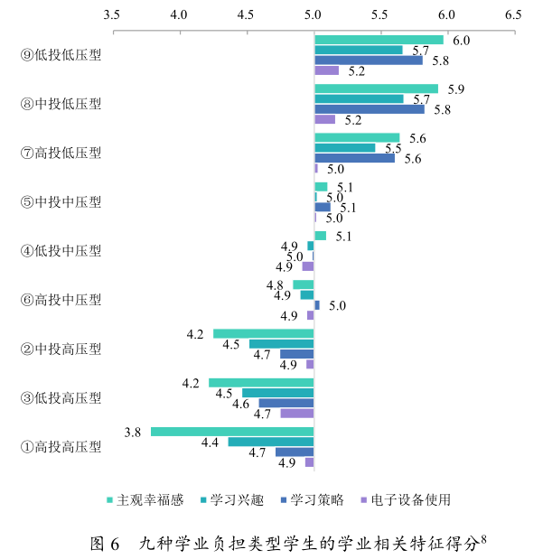 导读 2020年5月15日,苏州市教育质量监测中心召开新闻发布会,公布了面向社会的《2019年苏州市义务教育学业质量监测社会版报告》(以下简称《报告》)。《报告》主要包括心理健康、家庭教育、电子设备使用、体美劳教育、课外补习和压力感受六个方面的监测结果。 本篇主要呈现“压力感受”专题的主要监测结果。 (注:本报告中此小点的“压力感受”均使用的是未转换的原始分,计分范围为0-6分,得分越高,表明学生的压力感受越轻,得分越低,表明学生的压力感受越重。) “父母要求”给学生带来的学习压力最大, “学校及老师要求”给学生带来的学习压力最小。 以七年级为例,“父母要求”给学生带来的压力值为2.92分,“同伴竞争”给学生带来的压力值为3.13分,“学校及老师要求”给学生带来的压力值为3.47分。这表明,在初中阶段父母给学生的要求相对较高,学校和老师给学生的要求则更为理性。同时,随着年级的升高,学生感受到的来自外界的压力越来越重(见图1)。 学生的自我压力感受随着年级的升高而加重。 监测数据显示,七年级、八年级和九年级学生在自我压力感受上的得分分别为2.79分、2.43分和2.10分,呈现出“随着年级升高,学生的自我压力感受逐渐加重”的趋势(见图2)。 初中女生自我压力感受明显高于男生。 监测数据显示,三个年级男生在自我压力感受指标上的得分分别为2.84分、2.55分、2.26分,三个年级女生在自我压力感受指标上的得分分别为2.72分、2.29分、1.92分,通过独立样本T检验发现,各年级男生得分均显著高于女生。同时,随着年级的升高,女生自我压力感受的加重程度大于男生(见图3)。 学业成绩好的学生“自我要求”压力感受较重,“学校及老师要求”压力感受最轻。 对学生四类压力来源进行排序,带来学习压力最大的排在第1位,计1分,带来学习压力其次的排在第2位,计2分;带来学习压力第三的排在第3位,计3分;带来学习压力第四的排在第4位,计4分。得分越低,表明给学生带来的学习压力越大。 监测结果显示,不同学业水平学生压力来源中压力最大的均是“父母要求”。水平I的学生除“父母要求”外,“自我要求”带来的学业压力最大,其次是“同伴竞争”,而“学校老师要求”带来的压力明显低于其他三个水平的学生;水平IV的学生除“父母要求”外,“学校老师要求”带来的压力最大,“自我要求”带来的压力最小,明显低于其他三个水平的学生(见图4)。这表明,学业成绩好的学生学习的动力主要是源于自身的内驱力,而学业成绩较差低的学生学习的主要动力则源于外部压力。 课业投入在中等水平且压力感受轻的学生,学业成绩最好。 学生的学业负担分为课业投入和压力感受两个部分。将课业投入和压力感受进行组合,可分为九种学业负担类型,分别是:①高投高压型、②中投高压型、③低投高压型、④低投中压型、⑤中投中压型、⑥高投中压型、⑦高投低压型、⑧中投低压型、⑨低投低压型。 监测结果显示,中投低压型,即课业投入在中等水平且压力感受轻的学生,学业成绩最好,为516.3分;低投高压型课业投入低且压力感受重和高投高压型课业投入高且压力感受重的两类学生,学业成绩最差,分别为481.5分和488.9分(见图5)。可见,并非投入越多、压力越大学生的学业成绩就越好,课业投入和压力感受均需控制在合理的范围内。 (注:课业投入指的是学生的客观学业负,主要包括“作业负担”和“补习负担”两个方面。课业投入量越高,表示学生的作业时间、补习时间越多;课业投入量越低,表示学生的作业时间、补习时间越少。) 课业投入在低水平和中等水平且压力感受轻的学生学业相关特征表现最好。 计算九种学业负担类型学生的学业相关特征,结果显示:低投低压型和中投低压型学生的学业相关特征表现最好,高投高压型的学生学业相关特征表现最差(见图6)。可见,要保持良好的学业相关特征,关键在于让学生的压力感受保持在较轻水平,且适度控制课业投入。 《报告》在呈现学生压力感受相关监测结果的基础上,还提出了具体建议: 关注减负增效,切实保障孩子身心健康发展 2018年12月28日,教育部等九部门印发《中小学生减负措施的通知》,明确政府、学校、校外培训机构、家庭各方责任,形成协同推进减负工作合力。本次监测结果表明,课外补习时间长的学生,近视比例更高;课外补习时间长的学生,主观压力感受更重,学习兴趣和主观幸福感更低;课业投入在中等水平且压力感受轻的学生,学业成绩最好;并不是作业时间越长,学生的学习成绩就越高。 因此,对于家长而言,一方面要认识到过重的学业负担会影响孩子的身心健康,避免额外加重孩子的学业负担,尽可能保证孩子充足的睡眠和体育锻炼时间等;另一方面,家长要正确看待课外补习,合理安排补习时间,避免盲目跟风报班。 对于学校而言,一方面,要加强减负增效各项工作落实,提高作业效能,严控作业总量,科学合理布置作业,提高作业效能;另一方面,要加强对家长和学生的引导,形成家校教育的合力,切实减轻违背教育教学规律、有损中小学生身心健康的过重学业负担。 《2019年苏州市义务教育学业质量监测社会版报告》系列文章推送 1 2 更多专题报告会陆续推送,欢迎继续关注~~