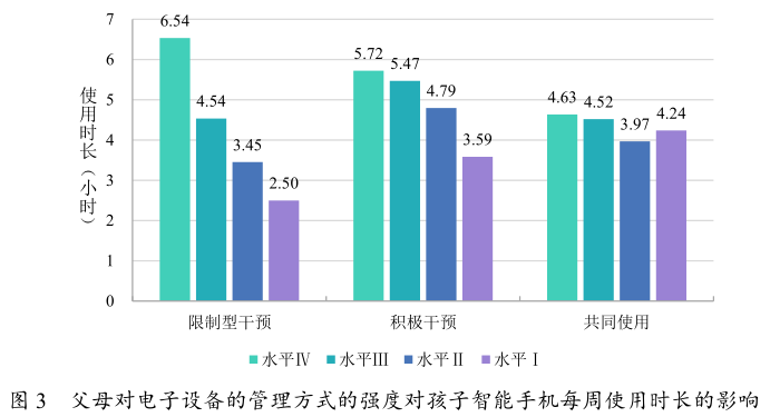 将家长对孩子电子设备使用的三类管理方式的强度(即得分)由高到低排序,并划分为四个水平(人数各占25%),前25%为水平I,后25%为水平IV。限制型干预管理强度从水平IV到水平I,学生每周智能手机的使用时长降低4.04小时;积极干预管理强度从水平IV到水平I,学生每周智能手机的使用时长降低2.13小时;共同使用管理强度从水平IV到水平I,学生每周智能手机的使用时长变化不大(见图3)。