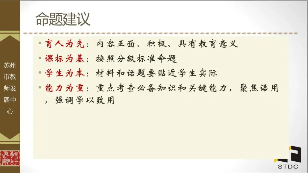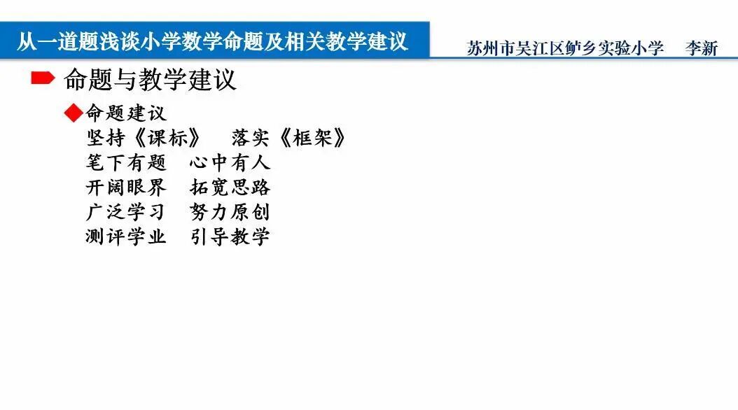 他认为,苏州监测的学科工具研发是一种指向核心素养的命题实践,具有五大特点:一是将必备知识、关键能力、学科素养、核心价值的考查嵌入真实的问题情境;二是设计任务,引导学生呈现运用知识技能、学科思维解决问题的过程;三是以高阶能力统摄低阶能力,让低阶能力成为完成复杂任务的一部分;四是引导学生通过陌生知识的“现场学习”解决问题;五是试题由封闭式向半封闭式、开放式倾斜。他还以历年的苏州监测试题为例对五大特点进行了解释,为2021年的命题提供样例。