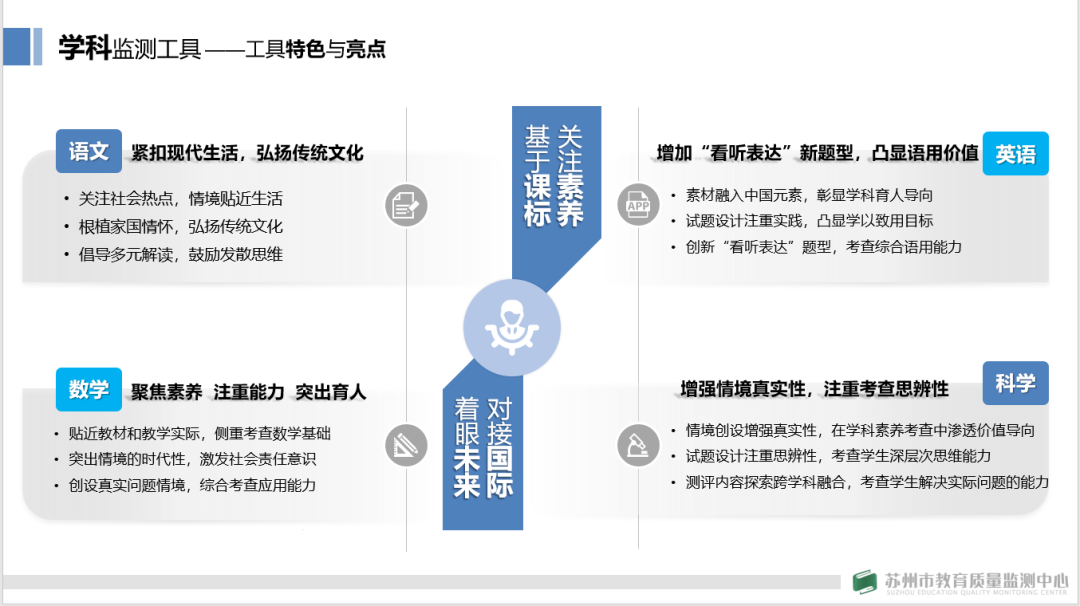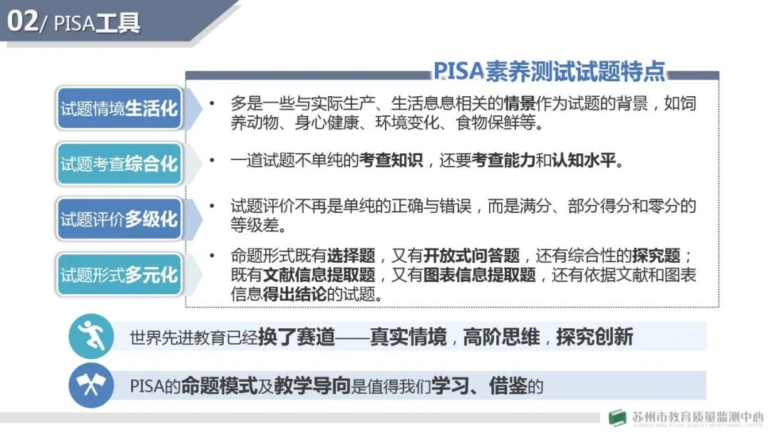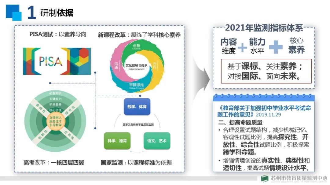 他指出,2021年苏州监测学科工具研发要延续“基于课标、关注素养;对接国际、面向未来”的基本原则,并分别从PISA、高考评价改革两个方面系统分析了2021年苏州学科监测工具研制的重要依据。