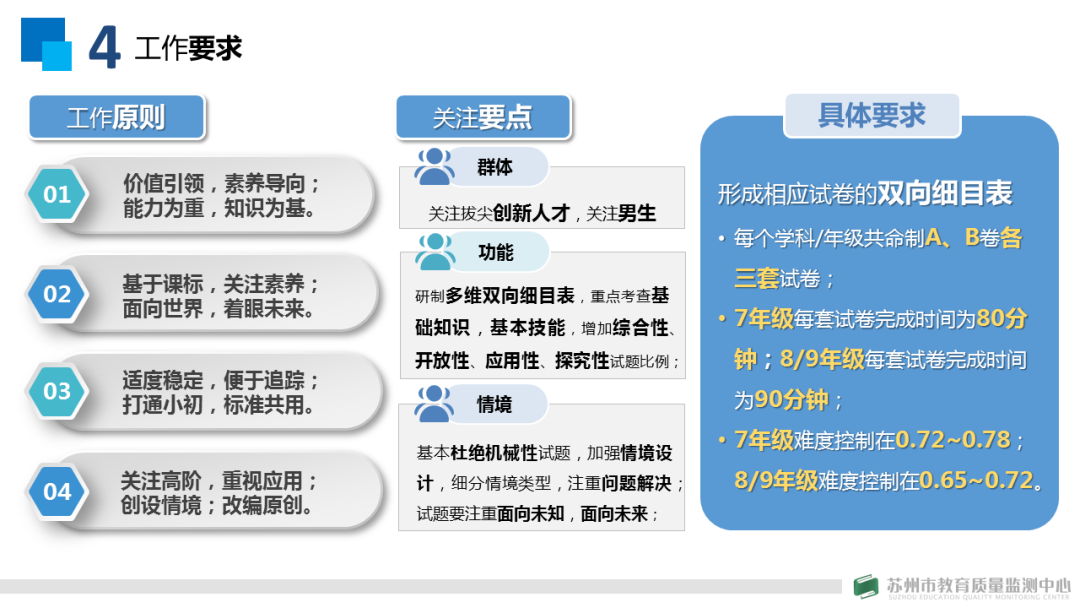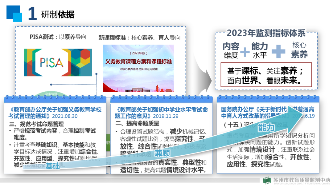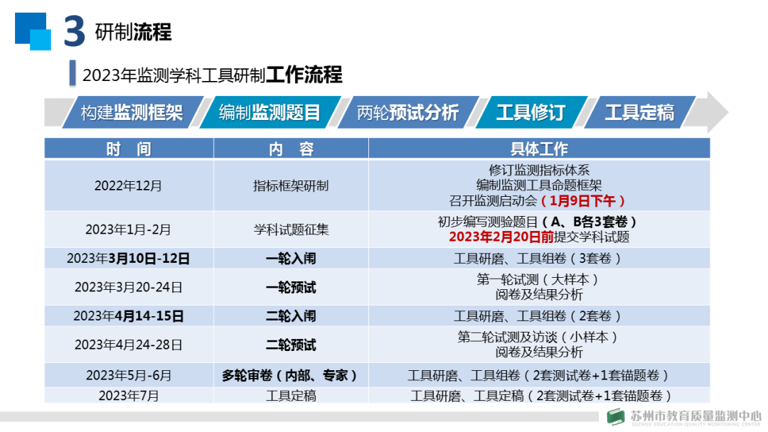 1月9日下午,苏州市教育质量监测中心组织召开了2023年苏州市义务教育学业质量监测学科工具研制启动活动。 0 1 专家队伍组建 2021年8月,教育部办公厅印发《关于加强义务教育学校考试管理的通知》,要求各地各校要加强命题研究评估和教师命题能力培训,不断提高教师命题水平。2022年1月,江苏省教育厅印发《江苏省义务教育学校考试管理规范》,再次强调要加强命题研究和教师命题能力培训,把命题能力作为教师专业发展的重要内容,在命题研究与培训方面,要加强学校之间的合作,发挥区域组织的优势,提升研究与培训质量。 为贯彻落实相关文件精神,加强苏州测评专家队伍建设,保障监测工具研制的质量,中心在全市范围内共邀请了182位学科专家共同组建了11个2023年义务教育学业质量监测工具研制学科小组,覆盖语文、数学、英语和科学四个学科,七年级、八年级和九年级三个年级。此外,为实现监测工具的小-初-高学段间的有效衔接,今年各学科的小学组中纳入了部分初中专家,初中组纳入了部分高中专家。2023年学科工具研制工作将历时7个月左右,182位专家将不同程度地参与各个环节的工作,这既是命题过程,也是命题能力培训的过程。 0 2 工具研制培训 会议伊始,中心主任王开东对各位专家参与学科工具研制工作表示感谢。随后,王主任重点强调了本次工具研制工作的重要性、科学性和保密性。 王主任指出,工具研制的质量和好坏,直接决定了监测结果的准确性,也直接影响到领导的教育决策,影响到区域和学校工作的改进,更影响到每年对30多万初中生学习的引导和矫正,所以工具研制的重要性无论如何强调都不为过。其次,监测更注重工具的导向性,即基于课标,关注素养,对接国际,着眼未来,这就需要各位专家一要吃透新课标,二要吃透中考,三要吃透国际PISA等先进的命题方法,四要看到国际上未来人才所需要的核心的素质和指标等,提高命题的科学性。最后,监测工具研制成本极高,监测工具研制的全环节都强调工作的保密性。监测工具命制,不仅是要命制当年监测试题,同时也在构建、积累监测题库系统。因此,对往年测试过的监测工具仍进行保密。请命题专家严守保密纪律,妥善保存、保护掌握的命题资料。 随后,中心研发部副主任宋一丹对各学科专家进行了2023年学科工具研制培训及工作布置。本次会议采用线上腾讯会议的方式进行。 宋主任首先对2022年全市义务教育学业质量监测的基本情况进行了全面回顾。随后,宋主任重点对2023年学科工具研制依据、研制要素、研制流程及命题要求等内容进行了详细解读与说明。 0 3 学科培训研讨 集中培训结束后,各学科组进行了分组培训及研讨。各学科组组长、副组长及学科秘书认真解读2023年学科工具命题指南,通过指标体系解读、监测典型例题解析及组内研讨等环节确保每一位小组成员都能明确本次征题的相关要求和具体任务。 本次启动活动顺利召开,各学科专家明确了2023年监测指标的变化、研发要求以及命题任务,为后续的征题及入闱工作的顺利进行奠定了良好的基础。 End 编辑丨周利 审核丨王开东 宋一丹