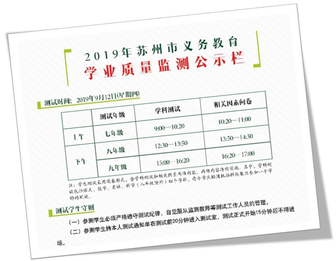 9月12日,苏州举行了2019年全市义务教育学业质量监测。本次监测是苏州市教育局、苏州市人民政府教育督导室组织实施的第五次全市义务教育学业质量监测,是基于监测大数据对苏州教育的一次全面健康体检,旨在建立体现素质教育要求、以学生发展为核心、科学多元的义务教育质量评估监测体系,客观反映各初中校学生学业质量、身心健康及其变化情况,深入分析影响教育质量的主要原因,为转变教育管理方式提供参考,引导社会树立正确的教育质量观,引导学校全面实施素质教育,规范办学行为,改进教育教学,助力苏州市义务教育质量的全面提升。