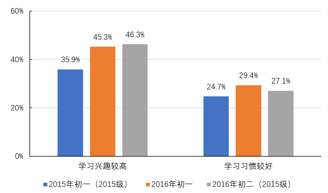 整体上来看,苏州初中学生的学习兴趣越来越高,学习习惯也越来越好。对于同一批学生来说(2015级,2015年初一和2016年初二),经过一年的学校教育,学生的学习兴趣明显增强,但是学习习惯并没有得到明显改善。