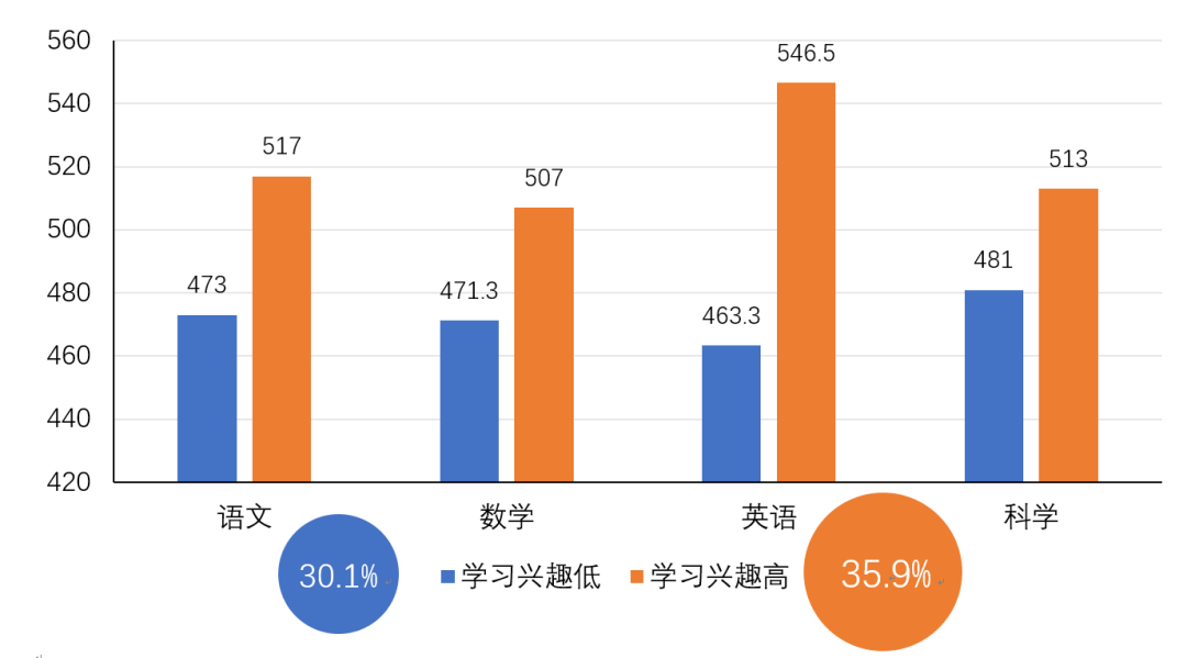 监测结果显示,学习高的学生,其各科学业成绩均明显高于学习兴趣低的学生。