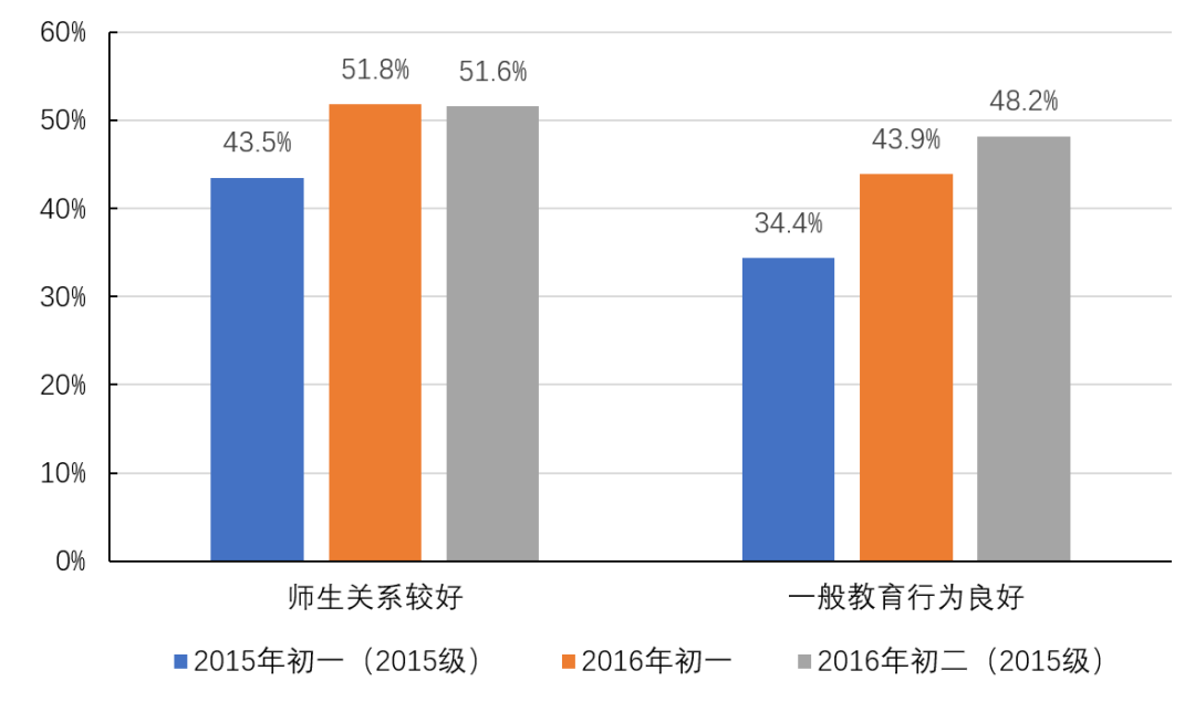 监测结果显示,2016年初一和初二反映师生关系较好、教师教育行为较好的学生比例较高,明显好于2015年初一,说明学校和教师都更加关注良好学习环境和学习氛围的创设。