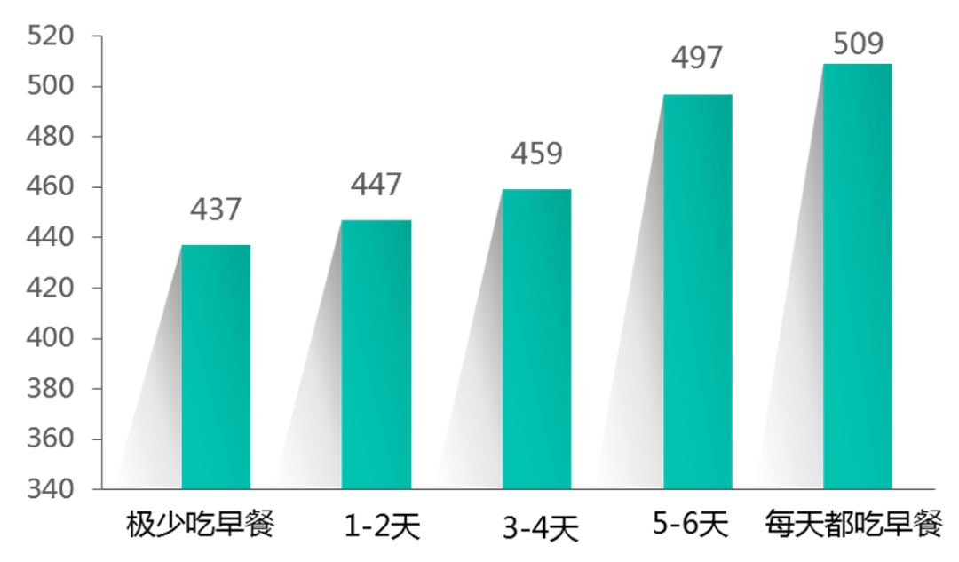 学生每周吃早餐的天数与学业成绩呈现明显正相关,每天都吃早餐的学生各科学业成绩的均分是509分,而极少吃早餐的学生各科学业成绩的均分是437分,二者相差72分。