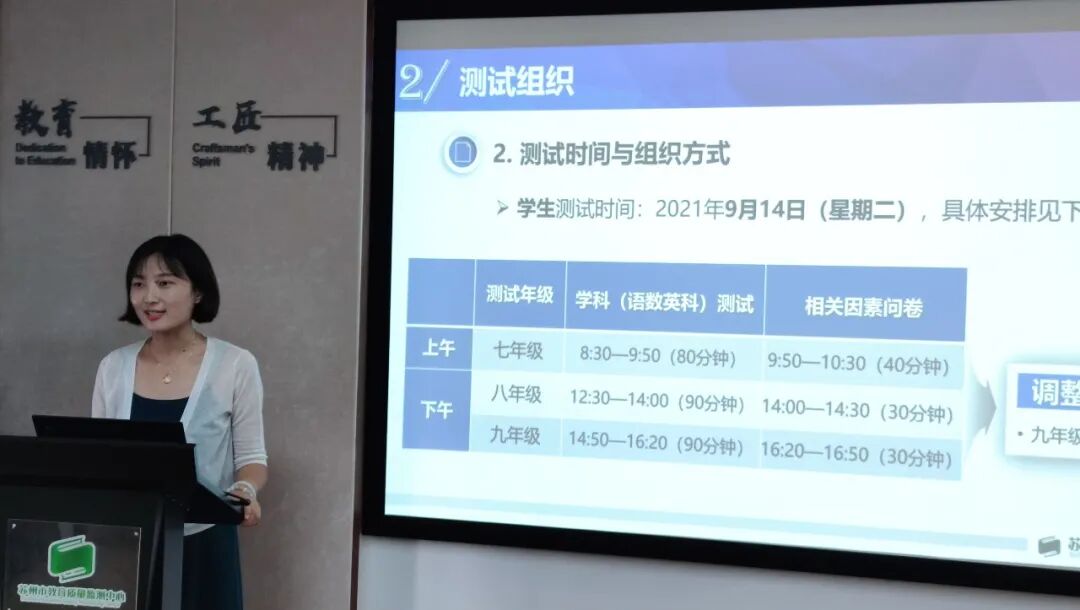 为深入贯彻落实《深化新时代教育评价改革总体方案》和《义务教育质量评价指南》等文件精神要求,客观反映各初中校学生学业质量、身心健康及其变化情况,引导社会树立正确的教育质量观,助推苏州市义务教育质量的全面提升,苏州市教育质量监测中心在苏州市教育局、苏州市人民政府教育督导室的领导下,将于2021年9月14日在全市范围内开展义务教育学业质量监测。8月27日下午,中心召开了监测实施区域工作培训会议,中心罗强主任、中心薛瑾副主任、苏州市教育考试院党支部杨佳颖副书记、各市(区)监测负责人以及招考办负责人等参加了此次培训会。