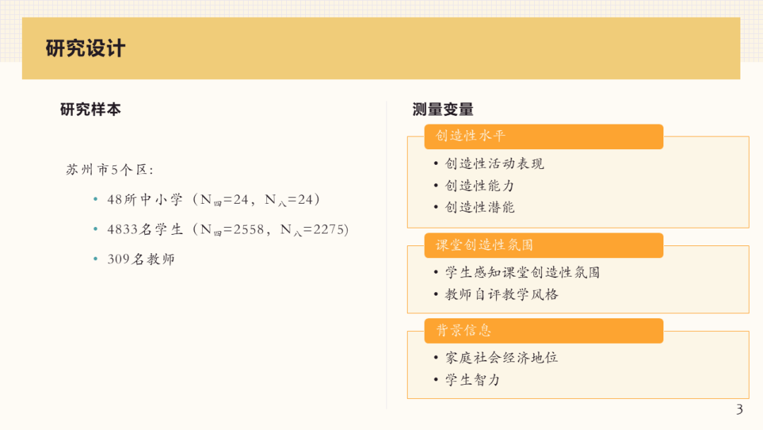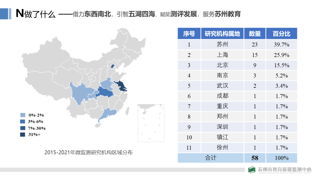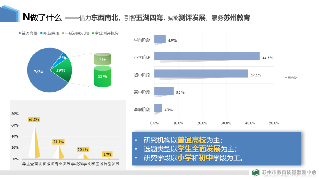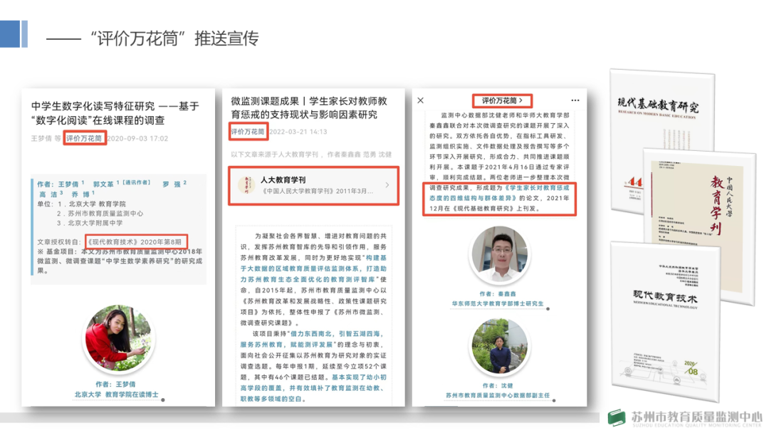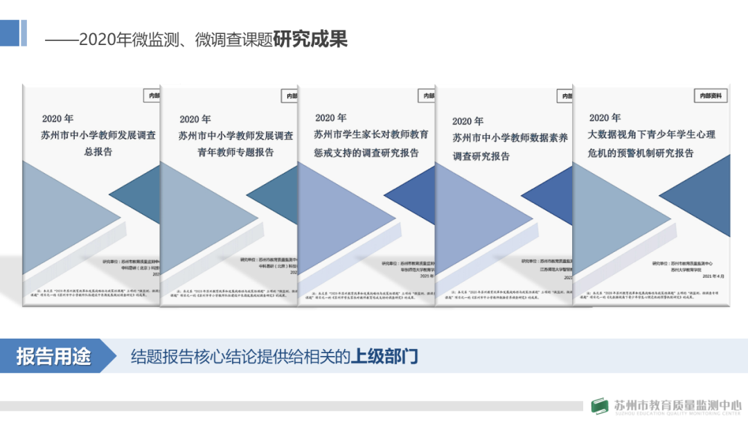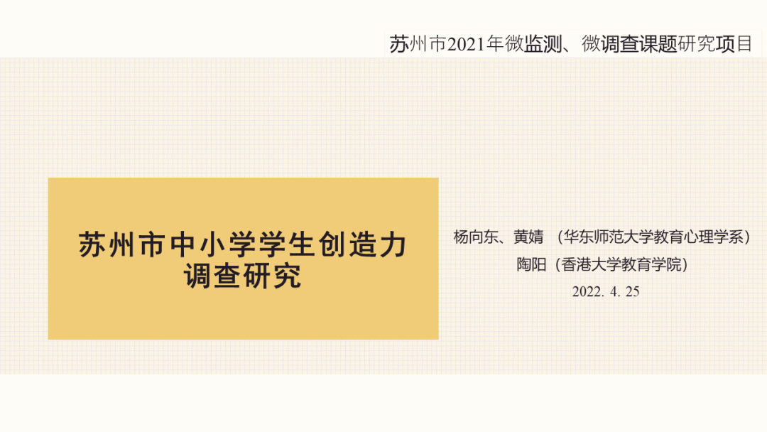2022年4月27日,苏州市教育质量监测中心组织开展了2021年微监测、微调查课题结题线上评审活动。 本次结题评审活动特别邀请了重庆市教育评估院原院长龚春燕、浙江省教育厅教研室评价教研员陈荣荣、江苏省中小学教学研究室、江苏省基础教育质量监测中心办公室主任周世科、苏州市教师书院副院长王开东、苏州市教育博物馆副主任邢华作为评审专家。苏州市首届教育测评高研班、姑苏区和常熟市测评高研班的部分学员、2022年微监测立项课题组部分成员及中心课题秘书共135人参加了本次活动。苏州市教育质量监测中心主任罗强主持活动。 一、微监测项目介绍 中心主任罗强指出, 苏州教育质量监测构建了“1+N”的教育质量监测体系,这里1=1项主业,N=定制服务+微监测。1为N提供工具、技术、经验支撑,N为1提供养分、拓展空间、搭建桥梁。微监测项目的实施是想实现“借力东西南北,引智五湖四海,赋能测评发展,服务苏州教育”的目标。 自2015年起,中心以《苏州教育改革和发展战略性、政策性课题研究项目》为依托,整体性申报了《苏州市微监测、微调查研究课题》,面向社会公开征集以苏州教育为研究对象的实证调查选题,延续至今,每年申报1期。截至2021年,已立项58个课题,其中有52个课题已结题,基本实现了幼小初高学段的覆盖,并有效填补了教育监测在幼教、职教等多领域的空白。 2021年3月18日,苏州市教育质量监测中心面向社会发布2021年微监测、微调查课题研究公告,共收到申报课题17项。经专家小组综合评定,6项选题被确定为2021年微监测、微调查课题。随后,各课题负责人于5月进行实施方案的撰写与修改;5~8月顺利完成抽样;5~9月各课题进行课题实施;6~12月各课题进行数据分析;2022年1~4月进行结题报告的撰写与修改;2022年4月进行结题评审。 微监测、微调查课题研究成果会以多种形式呈现:一种是将优秀的研究成果收入《苏州教育绿皮书》,另一种是以学术论文的方式在学术期刊上面发表,同时还会通过公众号“评价万花筒”进行推送宣传,力图将优质的课题研究成果与更多的教育同行共享。 << 滑动查看下一张图片 >> 二、2021年微监测课题分享 《苏州市中小学生阅读能力评估与研究》是由北京大学教育学院蒋承教授主持开展的研究。 << 滑动查看下一张图片 >> 该课题面向苏州市五年级和七年级学生开展调研评估工作,评估依据《义务教育语文课程标准》(2011年版)对各学段学生阅读能力的具体要求进行,同时借鉴国际阅读评价体系(PISA、PIRLS、NEAP),结合苏州学生实际情况,对苏州中小学生的阅读能力进行客观评价与展示,然后对中小学生阅读能力的影响因素与路径机制进行定量分析。最后课题组基于苏州市中小学生阅读能力评估数据,从学生、家长和学校三个层面分别给出了具体可操作的阅读提升建议。 《苏州市中小学班主任胜任力的影响因素与提升策略研究》是由华东师范大学教育学部秦鑫鑫博士及其导师冯大鸣教授主持开展的研究。 << 滑动查看下一张图片 >> 该研究基于苏州市18所中小学校583位班主任的问卷调查,了解了苏州市中小学班主任胜任力的现状与差异,通过多元回归分析、中介效应分析探究了班主任胜任力的影响因素以及班主任胜任力对班主任留岗意愿和班主任未来职业选择的影响等方面。最后着眼于苏州市班主任胜任力提升与班主任队伍的整体建设,提出了有针对性的政策建议。 《苏州市小学教师队伍监测评价研究》是由上海市闵行区教育测评与研究中心曾庆彪主任及其团队开展的课题研究。 << 滑动查看下一张图片 >> 该研究综合考虑不同办学性质、办学规模、办学质量等因素,在苏州市辖10个市(区)内抽取137所小学参与调研,约占总体小学数量的30%,从教师专业素养、教师教育与培训、学校管理与文化、政府保障支持四个方面,对影响教师队伍建设情况进行了全方位、多角度的研究。 《家庭教育因素对学生身心健康及学业成绩的影响研究》是由苏州大学教育学院孔明教授及其团队开展的研究。 << 滑动查看下一张图片 >> 该研究从家庭教育的两个方面,即教育认知、教育行为出发,采用家长问卷测量并全面细致地分析家长在教育过程中这些方面的具体表现,并结合学生各方面(如学习倦怠、学业成绩、学习动机、心理健康水平等)的情况,全面细致地分析出家长的教育认知及教育行为影响学生身心健康及学业成绩的内部机制,为提高家庭教育质量、更有效地教育孩子提供实证依据,并为解决家庭教育中存在的问题提供方向。 《苏州市中小学学生创造力调查研究》是由华东师范大学教育学部杨向东教授主持的课题,本次结题由香港大学教育学院的陶阳博士代表课题组进行汇报。 << 滑动查看下一张图片 >> 该项目采用分层抽样随机抽取了48所中小学及309名任课教师,围绕学生在具体领域中的创造性活动表现、创造性能力、创造性潜能以及课堂创造性氛围四个方面,分析当前中小学生创造力和课堂氛围的现状、探讨个体创造力水平背后的影响机制以及学生创造性水平与学业成绩之间的关系,从而为科学地认识、培养和激发学生的创造力提供实证依据。 三、专家点评与指导 各评审专家对五个课题的研究工作给予了高度评价和充分肯定。其中,重庆市教育评估院原院长龚春燕指出五个研究主题的展示有四个特