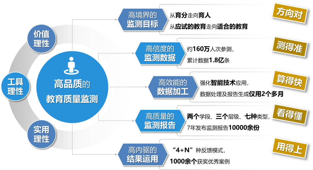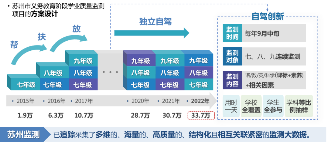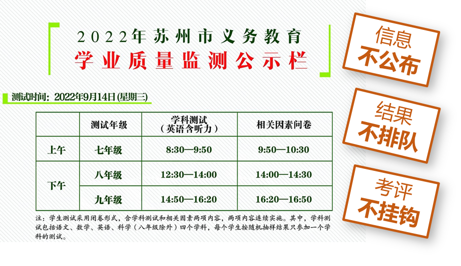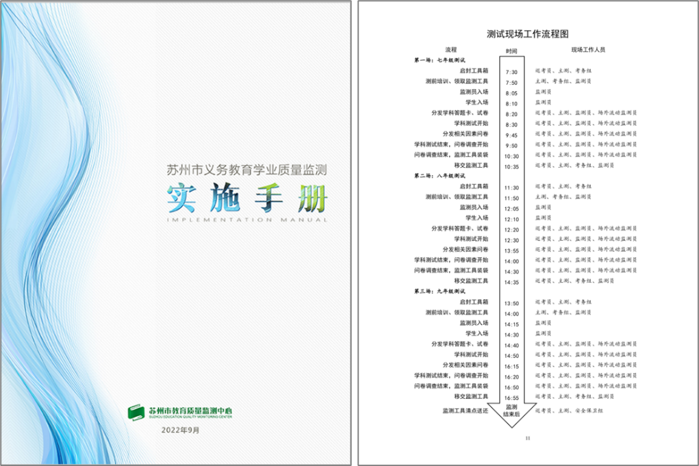 监 测 实 施 为深入贯彻落实中共中央、国务院《深化新时代教育评价改革总体方案》和教育部《关于加强义务教育学校考试管理的通知》等文件精神,进一步完善我市义务教育质量监测制度,促进义务教育优质均衡发展,助力“双减”政策落地见效,推动义务教育质量和学生身心健康水平不断提升。 9月14日,苏州组织了2022年全市义务教育学业质量监测。本次监测是在苏州市教育局、苏州市人民政府教育督导室领导下,苏州市教育质量监测中心负责统筹规划和组织实施,市教育科学研究院、市考试院、市电化教育馆等部门协调配合开展的全市第八次义务教育学业质量监测。 一 2022年监测组织实施情况介绍 本次监测的对象是全市2022-2023学年度所有初中学校的全体学生和全体专任教师。采用“学校全覆盖、学生全参与、学科等比例抽样、相关因素全测”的组织方式,学生通过等概率随机抽样,只参加语文、数学、英语和科学学科中一门科目的考试以及对应学科的相关因素问卷调查,全市范围内共307个监测点,336891名学生以及25726名教师参加测试。 监测不公布参测对象个人信息,监测结果不排队、不排名,也不与区域、学校、教师的考评挂钩! 2022年苏州市义务教育学业质量监测公示栏 本次监测包括学科测试和问卷调查两部分。学科测试内容为《义务教育课程方案和课程标准(2022年版)》规定的学生语文、数学、英语和科学四门学科的学业要求。问卷调查包括学生问卷和教师问卷,学生问卷重点关注成长背景、一般学习行为、身心健康、学习品质、学业负担和学业支持等相关影响因素;教师问卷主要调查管理工作、教学工作、职业状态和学校满意度等情况。具体测评内容框架见下图: 2022年苏州市义务教育学业质量监测测评内容框架 为保障测试组织工作的顺利实施,苏州市教育质量监测中心编发了《2022年苏州市义务教育质量监测实施手册》,并制作现场操作视频,进一步优化监测实施工作流程和规范标准。测试前,分别对各市(区)监测负责人和市直属学校负责人进行实施工作培训,并在各市(区)安排视导员,各市(区)对下辖每所学校安排巡考员,负责监测组织实施工作进行巡视、督查。 2022年苏州市义务教育学业质量监测实施手册 2022年苏州市义务教育学业质量监测实施培训会(区域) 2022年苏州市义务教育学业质量监测实施培训会(直属初中) 二 苏州市义务教育学业质量监测简介 自2015年起,苏州就启动了“义务教育学业质量监测”项目,每年9月中旬,采用“学校全覆盖、学生全参与、学科等比例抽样”的组织方式,对全市初中三个年级学生进行连续追踪监测,实现对学生学业质量及相关因素的全过程纵向评价和多维度横向评价。2015-2017年苏州监测主要依托中国基础教育质量监测协同创新中心的“帮扶放”合作机制,2018年起开始独立探索,并逐步构建了具有“国际视野、国家标准、苏州特色”的义务教育学业质量监测体系。通过8年的实践探索,实现了对全市义务教育阶段学校学业质量健康的连续“追踪体检”,已采集了“全覆盖、多维度、追踪式”的区域学业质量监测大数据,构建了区域教育质量健康体检的“超大型CT”,以此全面测量、描绘并把脉苏州教育生态的健康状况。 苏州监测既严格按照国家标准规范实施,又基于苏州区域层面对学业质量监测的独特需求开展实践探索。它不同于国家层面选取两个年级、每次监测两门学科进行的切片式监测,在实施层面具有三个鲜明的特点:一是全学段连续追踪。按照这一设计,七年级的监测实际上可以把六年级的小学学段末监测与初中七年级的起点监测合二为一,同时,通过对初中段学生的连续追踪监测,为学业质量监测进行全学段横纵对比,实现增值评价奠定基础。二是干扰少、信度高。监测时间固定放在每年9月中旬,这时,学生刚刚过完暑假,因此监测考查的是学生经过两个月遗忘后,依然牢固掌握的知识和稳定增长的能力,相当于体检中的“空腹验血”,这样获得的监测数据最为稳定,信度更高。三是监测内容全面。即同时监测语文、数学、英语和科学四门主要学科和学生、教师的相关因素,实现了对学业质量过程和结果的全面诊断。 苏州市义务教育学业质量监测发展历程 苏州监测始终以“让孩子们的努力更有价值”为目标,坚持“尊重差异,追求合适;激励增值,促进发展”的评价导向,推进“低利害、轻问责、增内驱、重改进”的教育评价,构建了以“高境界的监测目标、高信度的监测数据、高效能的数据加工、高质量的监测报告、高内驱的结果运用”为特征的高品质的教育质量监测体系,努力追求教育质量监测工作价值理性、工具理性和实用理性的完美统一。 通过8年的实践探索,苏州监测实现了面向全市初中学生的连续追踪监测,截至2021年,累计参测学生超过160万人次,积累监测数据超过1.8亿条,累计发放10000余份监测结果报告,包括《主报告》《学科数据报告》《学生相关因素报告》和《教师相关因素报告》,高质量的监测大数据正在为苏州教育推进教育评价改革、优化教育生态提供重要支撑。 苏州市义务教育学业质量监测的品质追求 苏州市义务教育学业质量监测严格按照标准化流程和相关规范要求进行,前后历时完整1年,历经监测实施方案拟定、监测指标研制、监测工具研发、多轮预试与修订