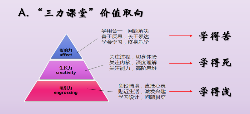 在语文教学评价方面,首先采用“三力课堂”价值取向,即让教学情境有吸引力,教学过程有生长力,教学结果重影响力。具体表现为创设情境,直抵心灵;关注过程,切身体验;学用合一,问题解决等方面,从而达到化解学生苦学、死学和浅学的问题。