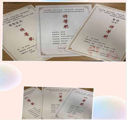 多人次获得苏州市诗词创作大赛个人和团体特等奖;经典诵读比赛团体特等奖;第十九届华人少年作文比赛一等奖;省“中学生与社会”作文大赛苏州市初中组二等奖等奖项。