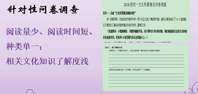 我校进行的初一学生文化问卷调查显示我校学生阅读量少、阅读时间短、阅读种类单一,相关文化知识了解度较浅。