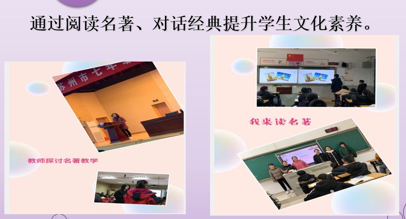 初一期间,有7个班先后进行了学生名著阅读自我汇报课;初二期间全年级进行了感受经典诵读比赛;同时教师也深入研讨相关课程,开设了一系列与名著相关的大市公开课,如在苏州市七年级“名著研读”教学研讨会中,语文组朱冬梅老师开设了《将整本书阅读教学“引”向深处》的讲座,王婧老师开始了《骆驼祥子》的公开课。师生共同研读名著,对话经典。