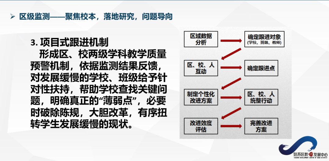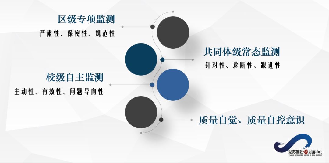 目前姑苏已形成多级监测网络,区级专项监测强化严肃性、保密性,规范性;共同体级常态监测突出针对性、诊断性、跟进性;校级自主监测落实主动性、有效性和问题导向性。同时提出:各级监测均要突出数据分析,切实加强针对性跟进举措,对所有数据、信息进行汇总、甄别、分类和深加工,得出科学、全面、可信的监测结果,明确提出改进建议,形成各种形式的教学质量监测分析报告和结果应用方案,通过各种途径跟踪调查各项改进措施的落实情况和实际效果。对于相对落后,需要引起重视的对象,学校层面要第一时间跟进,区域层面要不定期的跟踪,要通过监测树立质量自觉、质量自控意识,激发教师提升教学质量的主动性、创造性。