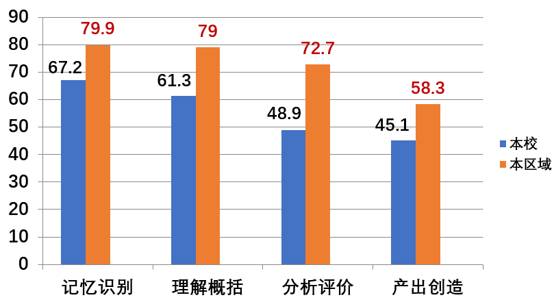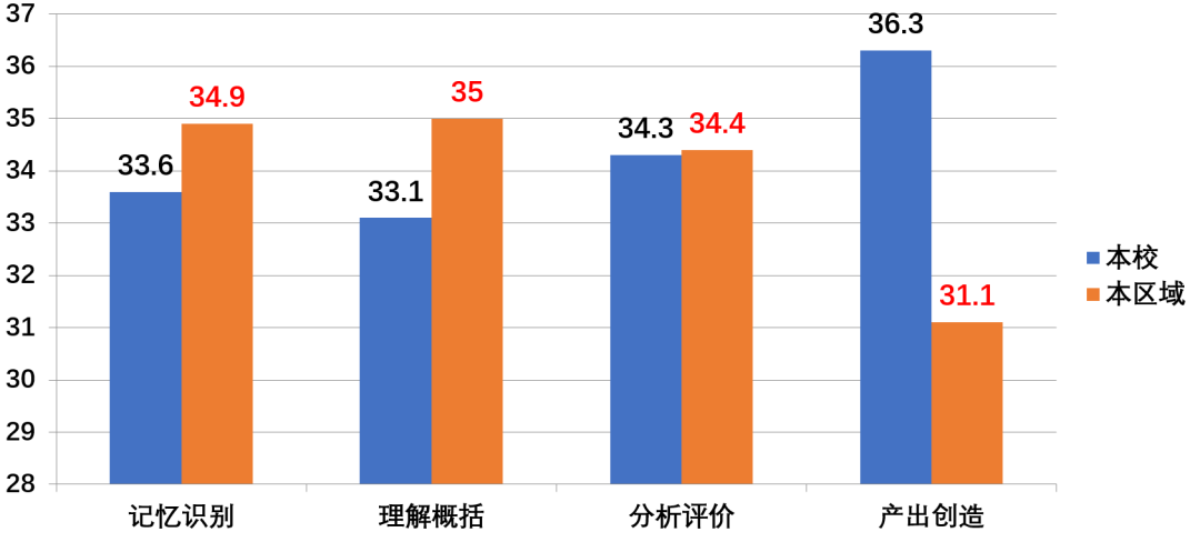 通过监测数据可知,我校虽然在文段表达中的“记忆与识别”以及“理解和概括”能力还低于本区域,需要不断努力,但是“产出与创造”这一维度我校已高于本区域。相信通过学校,教师,学生的共同努力,进行监测结果改进与实践,促进基层学校教育教学改进,提升教育教学质量,乡村学校的学子,未来亦可期。