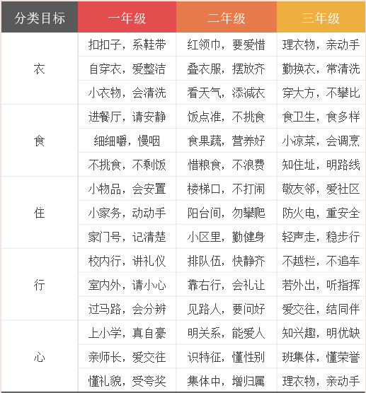 以密切联系孩子生活的实践活动为载体,引导学生在生活中学习,在学习中生活。学校从衣、食、住、行、心五个维度编制《“慧爱”家庭教育家校合作生活成长行为习惯目标指南》 ,以简洁明了、朗朗上口的三字经形式明确该年段孩子需要掌握的生活技能和行为习惯。通过创设“家庭劳动日”等,引导家长在生活时间中关注培养孩子生活自理能力和行为习惯的养成。