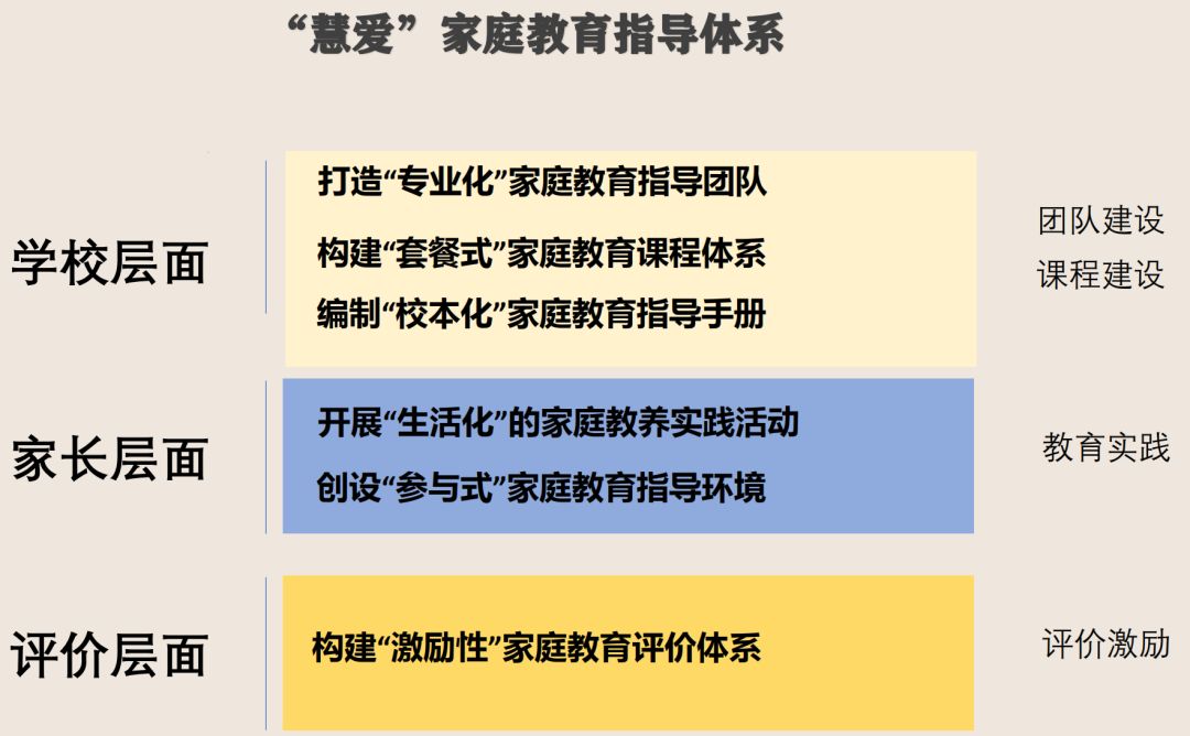基于这样的起点, 我们结合学校“用爱和智慧引领学生进步”的教育理念,构建“慧爱”家庭教育指导体系。