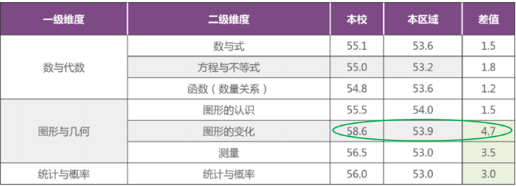 在2019年9月苏州义务教育学业质量监测中,我校学生在数与代数、图形与几何、统计与概率三个板块均高于本区域平均水平,特别是在图形的变化这一块,有原来低于本区域4.9%,现在高出本区域4.7%。