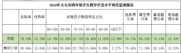 同年10月份,在太仓市四年级学生数学学业水平监测中,我校学生在优秀率、合格率、每一大题得分率等方面较以往也有了很大的提升,各项指标均高于市平均,在全市30多所学校中我校总均分进入前十,这也得益于我校对作业改革的研究。