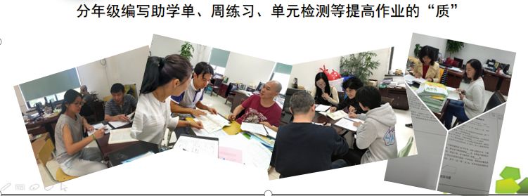 每周二下午我校数学组分年级在指定地点进行2节课时间的集体备课,根据教学内容和学情,从目标、重难点、易错点进行习题的研讨,编写助学单、周练习、单元检测等提高作业的“质”。
