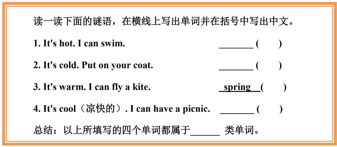 预习单的设计需突破两个难点:一要有趣味性;二不能太难,要寻找到学生力所能及的那个点。如在学习4B U5 Seasons时,星洲学校的张军老师设计了这样的预习单: