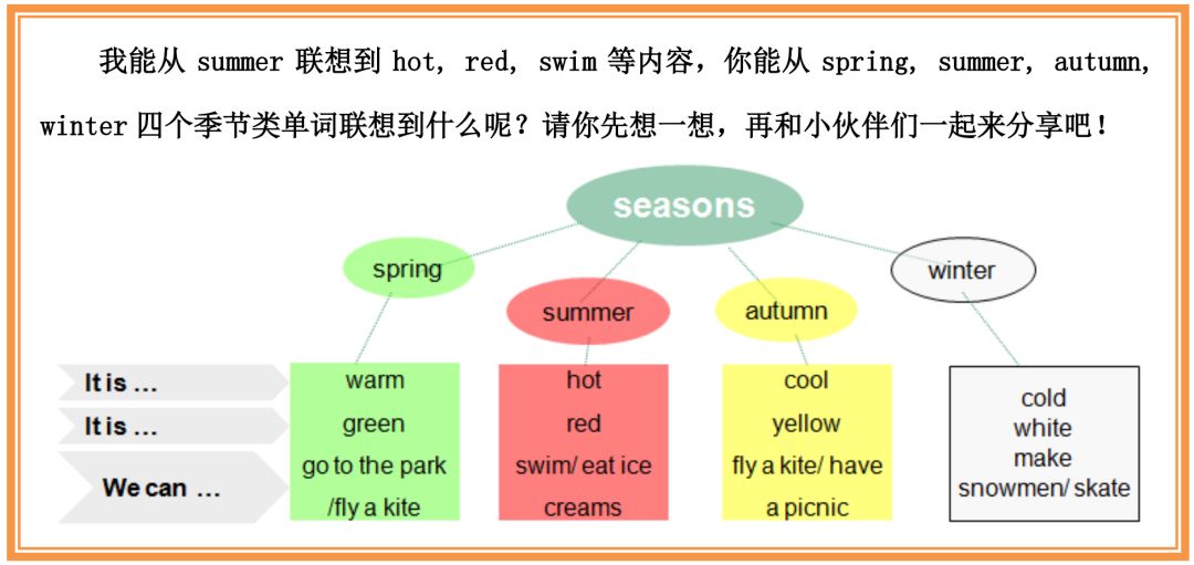 课堂共习单可以利用课堂上的互动学习环境,发挥同伴合作的优势,互相激发思维,多渠道运用词汇、内化语言。还是以4B U5 Seasons为例,张军老师设计了这样的课堂共习单: