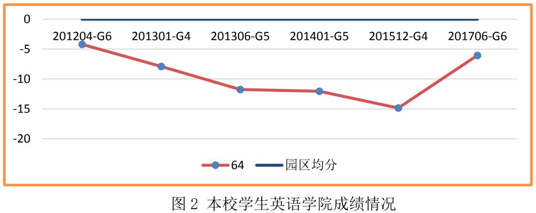 对监测中反映出的薄弱学校进行了跟进式帮扶,组织了一系列网络与集中相结合的校本研训活动;优化词汇在语境中运用能力的教学策略;帮助教师明确各年级词汇教学目标序列,提高教师命题能力等。经过一年半的努力,实验学校的学生进步显著。以均分连年下滑的“64学校”为例,该校在2017年6月组织的全区质量监测中,学生英语学业成绩取得了明显提升。(详见图2)