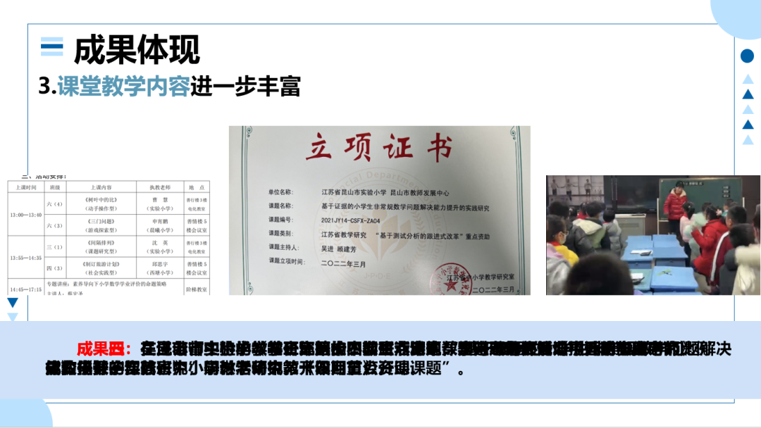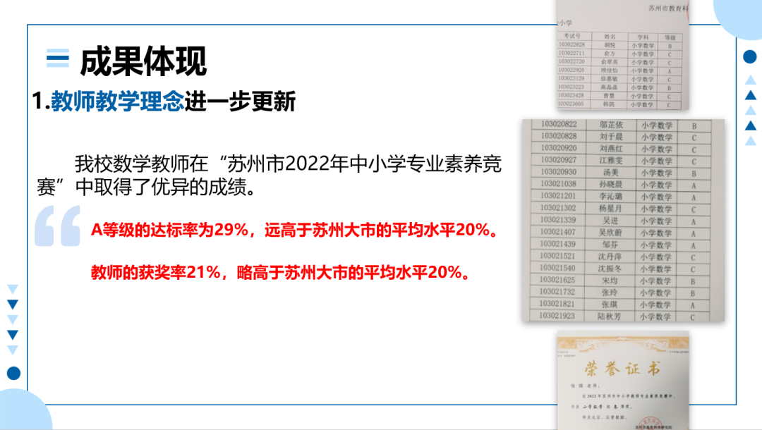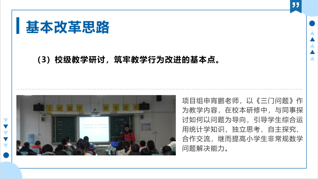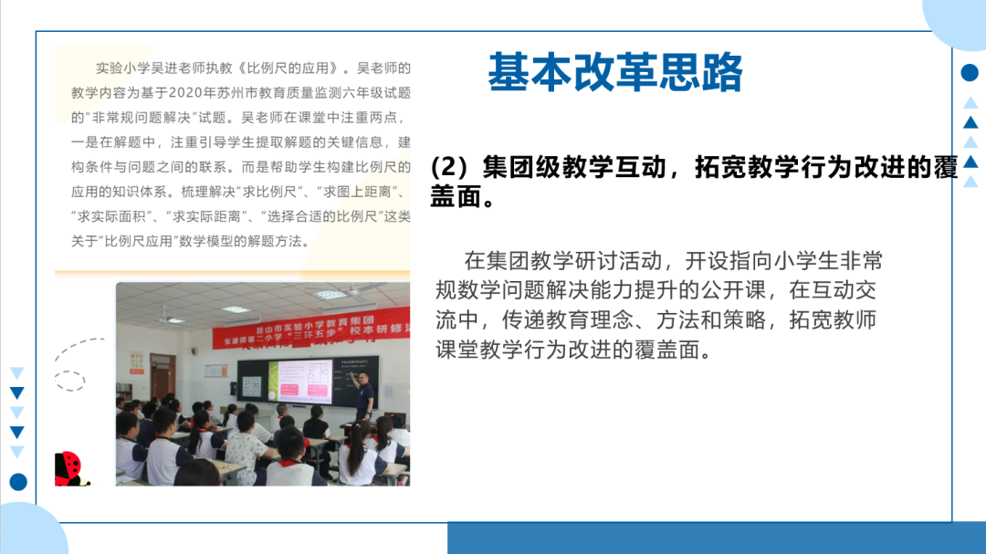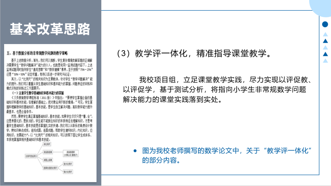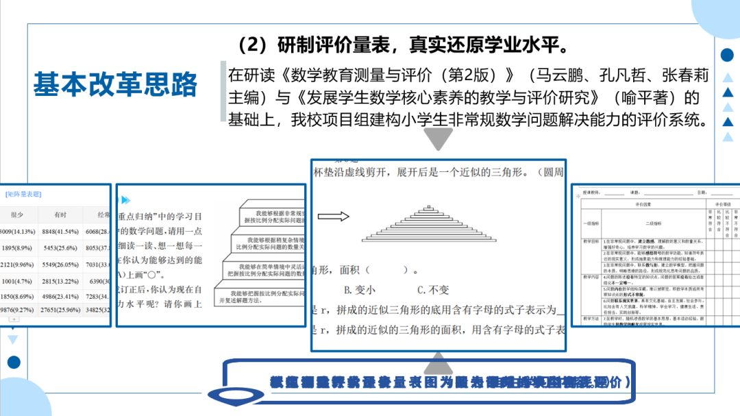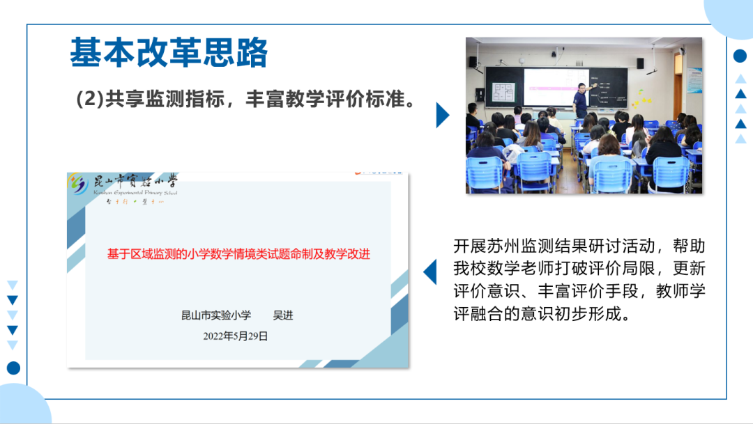 作者:吴进 昆山市实验小学 01 (一) 数据显示 在学科教学方面,教师教学行为近三年呈下降态势、波动较大; 在学业成绩方面,我校学生的数学成绩总体处于领先地位,学生的“非常规问题解决”处于本区域较高水平,但是从学生具体解答情况来看,大多数学生缺乏解决问题的方法与策略,有些题目得分低或不得分的情况比较多。 (二) 问题分析 经过我校数学教研组深入分析监测数据,结合教学实际,聚焦以下几个主要问题:①教师教育教学理念有待更新;②学校学科教学资源有待丰富;③教师教育教学行为有待改进;④学校“教学评一体化”的实践有待落地。 02 基于问题诊断,我们确立以下基本思路:①理念引领,丰富教师专业素养;②内容为基,扩充教师教学资源;③实践为主,改进教师教学行为;④评价为导,指导教师课堂教学。具体制定了以下推进策略: 1. 加强专业培训,丰富教师专业素养 我校依托“智行慧心”苏州市“四有”好教师团队、“一体多元”慧创科技育人苏州市课程基地建设,全方位加强我校教师的专业培训。具体包括:①共研课程标准,更新教育教学理念。去年下半年我校数学教师共学习4次高质量的《新课标》专业讲座。②共享监测指标,丰富教学评价标准。我校数学教研组积极开展苏州监测结果研讨活动。③共读专业书籍,提升教育科研能力。我校积极开展青年教师读书心得评比活动、“道德讲堂”读书分享活动等等。 << 滑动查看下一张图片 >> 2. 开发教学内容,扩充教师教学资源 我校组织数学老师们,整理出现有教学内容中已有的非常规数学问题资源,在不增加学生、教师负担的情况下,对现有资源整合、改进、创新。具体包括:①现行教材教学内容的深度挖掘。如,针对教材《制定旅游计划》一课,我们进行了项目化活动设计。②学业质量监测试题的课堂转化。如,在《生活中的数学问题》一课中,同时以三道苏州监测试题作为教学内容,帮助学生梳理解决问题的方法与策略。③评价学生能力发展的试题命制。我校积极组织老师命制评价学生能力发展的监测试题,为题库的建设、常态化评价打下基础。 << 滑动查看下一张图片 >> 3. 落实教研活动,改进教师教学行为 我校着力开展“三维四级”校本研修,提升教师的专业理解力、课程与教学能力等专业素养。具体包括:①区县级教学展示,构建教学行为改进的共同体。我校教师以苏州监测典型例题为载体,展示了促进学生能力生长的教学过程。在专家引领、学员探讨、教师分享的过程中,形成教学行为改进的共同体。②集团级教学互动,拓宽教学行为改进的覆盖面。在集团教学研讨活动中,开设指向小学生非常规数学问题解决能力提升的公开课,在互动交流中,传递教育理念、方法和策略,拓宽教师课堂教学行为改进的覆盖面。③校级教学研讨,筑牢教学行为改进的基本点。教研组老师,以《三门问题》作为教学内容,在校本研修中,与同事探讨如何以问题为导向,引导学生独立思考、自主探究、合作交流,培养学生综合运用知识解决数学问题的能力。 << 滑动查看下一张图片 >> 4. 融合评价系统,指导教师课堂教学 基于成熟的、科学的研究成果,我校重新调整、设计、构建小学生非常规数学问题解决能力评价系统。具体包括:①设计调查问卷,深入分析教学现状。如,设计了《对小学数学教师教学数学“综合与实践”活动课的现状调查》的调查问卷。②研制评价量表,真实还原学业水平。在研读各类专业书籍的基础上,我校尝试建构小学生非常规数学问题解决能力的评价系统。③教学评一体化,精准指导课堂教学。我校立足课堂教学实践,尽力实现以评促教、以评促学。 << 滑动查看下一张图片 >> 03 本案例自立项以来,工作组成员围绕指向小学生非常规数学问题解决能力提升的实践机制与评价系统,以课堂教学为主阵地,以影响教育教学的相关因素为研究对象,扎实开展相关研究,并取得了一定的研究成果。 1.指向小学生非常规数学问题解决能力提升的教师教学理念进一步更新。我校数学教师在“苏州市2022年中小学专业素养竞赛”中取得了优异的成绩。 2.指向小学生非常规数学问题解决能力提升的课堂教学内容进一步丰富。成果有项目化的主题实践活动设计、有日常作业设计、有试题库的建设等等。 3.指向小学生非常规数学问题解决能力提升的各级教研活动进一步实施。成果有省教研课题的立项、教学活动的展示等等。 4.指向小学生非常规数学问题解决能力提升的各类评价工具进一步发展。成果有苏州市规划课题的立项、有调查问卷的设计、有评价量表的制作等等。 5.指向小学生非常规数学问题解决能力提升的教学评一体化实践进一步落地。成果有论文的发表、调查报告的撰写等等。 实践表明,教学评一体化有利于立足教学一线的问题解决,有利于教师专业化发展,有利于学生全面发展。今后,我们将继续加强监测结果的分析与应用,打通监测结果运用的“最后一公里路”。 编辑丨许士中 审核丨王开东 于飞飞
