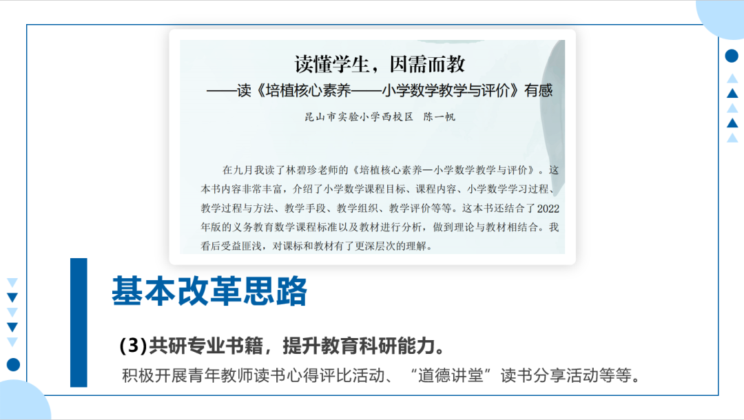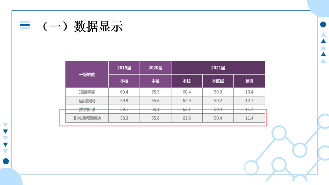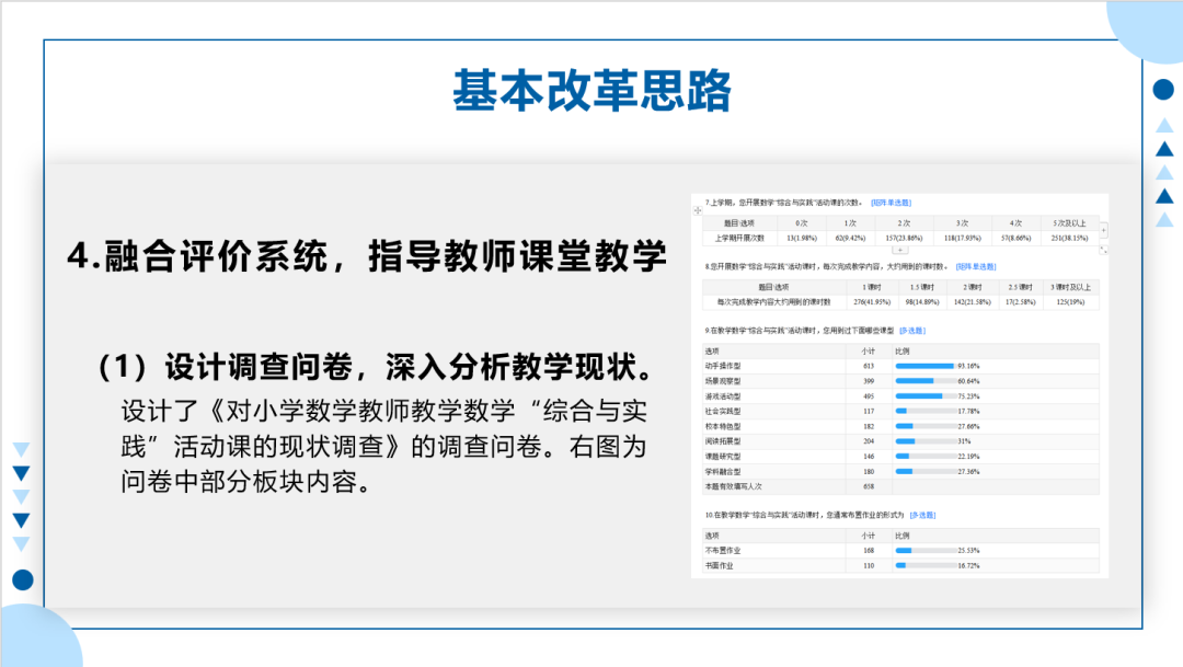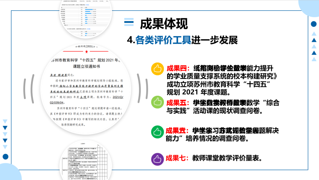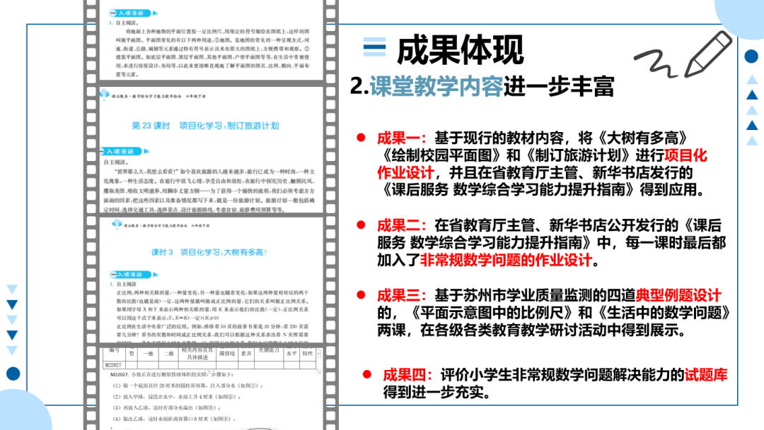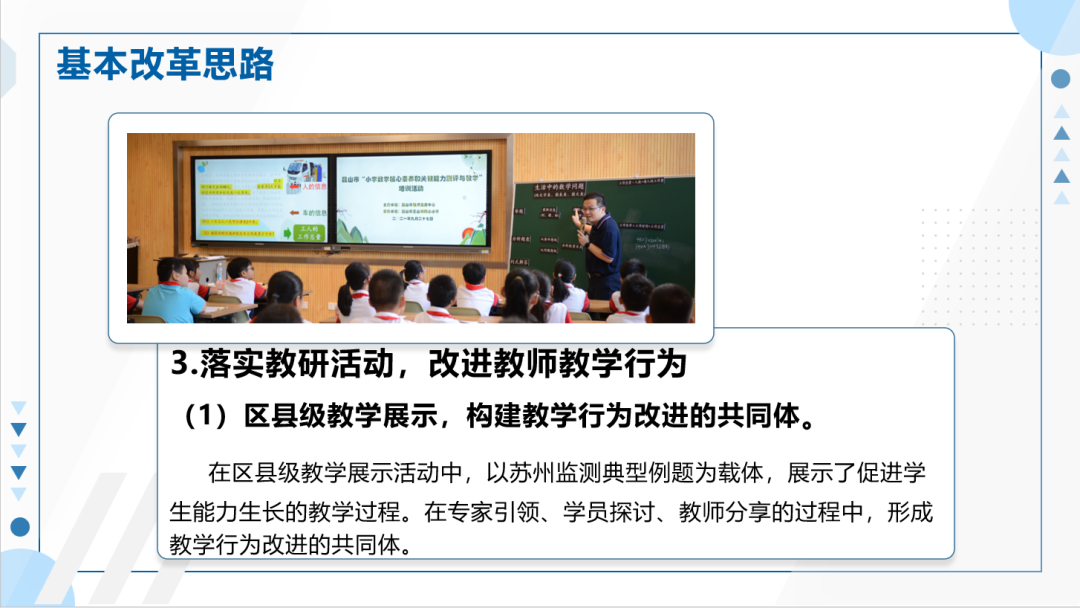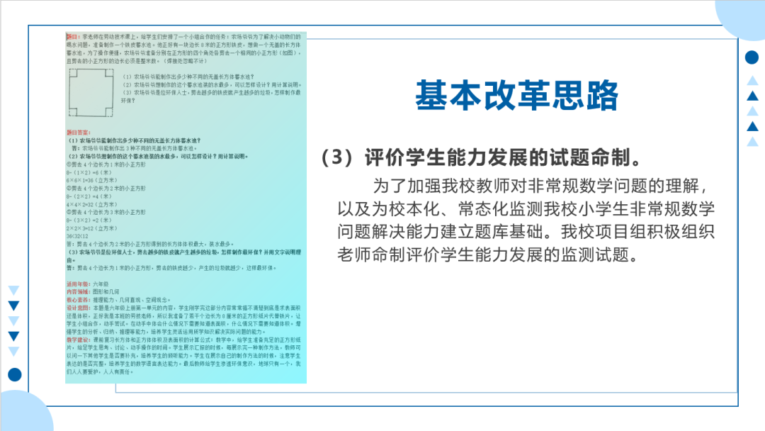 作者:吴进 昆山市实验小学 01 (一) 数据显示 在学科教学方面,教师教学行为近三年呈下降态势、波动较大; 在学业成绩方面,我校学生的数学成绩总体处于领先地位,学生的“非常规问题解决”处于本区域较高水平,但是从学生具体解答情况来看,大多数学生缺乏解决问题的方法与策略,有些题目得分低或不得分的情况比较多。 (二) 问题分析 经过我校数学教研组深入分析监测数据,结合教学实际,聚焦以下几个主要问题:①教师教育教学理念有待更新;②学校学科教学资源有待丰富;③教师教育教学行为有待改进;④学校“教学评一体化”的实践有待落地。 02 基于问题诊断,我们确立以下基本思路:①理念引领,丰富教师专业素养;②内容为基,扩充教师教学资源;③实践为主,改进教师教学行为;④评价为导,指导教师课堂教学。具体制定了以下推进策略: 1. 加强专业培训,丰富教师专业素养 我校依托“智行慧心”苏州市“四有”好教师团队、“一体多元”慧创科技育人苏州市课程基地建设,全方位加强我校教师的专业培训。具体包括:①共研课程标准,更新教育教学理念。去年下半年我校数学教师共学习4次高质量的《新课标》专业讲座。②共享监测指标,丰富教学评价标准。我校数学教研组积极开展苏州监测结果研讨活动。③共读专业书籍,提升教育科研能力。我校积极开展青年教师读书心得评比活动、“道德讲堂”读书分享活动等等。 << 滑动查看下一张图片 >> 2. 开发教学内容,扩充教师教学资源 我校组织数学老师们,整理出现有教学内容中已有的非常规数学问题资源,在不增加学生、教师负担的情况下,对现有资源整合、改进、创新。具体包括:①现行教材教学内容的深度挖掘。如,针对教材《制定旅游计划》一课,我们进行了项目化活动设计。②学业质量监测试题的课堂转化。如,在《生活中的数学问题》一课中,同时以三道苏州监测试题作为教学内容,帮助学生梳理解决问题的方法与策略。③评价学生能力发展的试题命制。我校积极组织老师命制评价学生能力发展的监测试题,为题库的建设、常态化评价打下基础。 << 滑动查看下一张图片 >> 3. 落实教研活动,改进教师教学行为 我校着力开展“三维四级”校本研修,提升教师的专业理解力、课程与教学能力等专业素养。具体包括:①区县级教学展示,构建教学行为改进的共同体。我校教师以苏州监测典型例题为载体,展示了促进学生能力生长的教学过程。在专家引领、学员探讨、教师分享的过程中,形成教学行为改进的共同体。②集团级教学互动,拓宽教学行为改进的覆盖面。在集团教学研讨活动中,开设指向小学生非常规数学问题解决能力提升的公开课,在互动交流中,传递教育理念、方法和策略,拓宽教师课堂教学行为改进的覆盖面。③校级教学研讨,筑牢教学行为改进的基本点。教研组老师,以《三门问题》作为教学内容,在校本研修中,与同事探讨如何以问题为导向,引导学生独立思考、自主探究、合作交流,培养学生综合运用知识解决数学问题的能力。 << 滑动查看下一张图片 >> 4. 融合评价系统,指导教师课堂教学 基于成熟的、科学的研究成果,我校重新调整、设计、构建小学生非常规数学问题解决能力评价系统。具体包括:①设计调查问卷,深入分析教学现状。如,设计了《对小学数学教师教学数学“综合与实践”活动课的现状调查》的调查问卷。②研制评价量表,真实还原学业水平。在研读各类专业书籍的基础上,我校尝试建构小学生非常规数学问题解决能力的评价系统。③教学评一体化,精准指导课堂教学。我校立足课堂教学实践,尽力实现以评促教、以评促学。 << 滑动查看下一张图片 >> 03 本案例自立项以来,工作组成员围绕指向小学生非常规数学问题解决能力提升的实践机制与评价系统,以课堂教学为主阵地,以影响教育教学的相关因素为研究对象,扎实开展相关研究,并取得了一定的研究成果。 1.指向小学生非常规数学问题解决能力提升的教师教学理念进一步更新。我校数学教师在“苏州市2022年中小学专业素养竞赛”中取得了优异的成绩。 2.指向小学生非常规数学问题解决能力提升的课堂教学内容进一步丰富。成果有项目化的主题实践活动设计、有日常作业设计、有试题库的建设等等。 3.指向小学生非常规数学问题解决能力提升的各级教研活动进一步实施。成果有省教研课题的立项、教学活动的展示等等。 4.指向小学生非常规数学问题解决能力提升的各类评价工具进一步发展。成果有苏州市规划课题的立项、有调查问卷的设计、有评价量表的制作等等。 5.指向小学生非常规数学问题解决能力提升的教学评一体化实践进一步落地。成果有论文的发表、调查报告的撰写等等。 实践表明,教学评一体化有利于立足教学一线的问题解决,有利于教师专业化发展,有利于学生全面发展。今后,我们将继续加强监测结果的分析与应用,打通监测结果运用的“最后一公里路”。 编辑丨许士中 审核丨王开东 于飞飞
