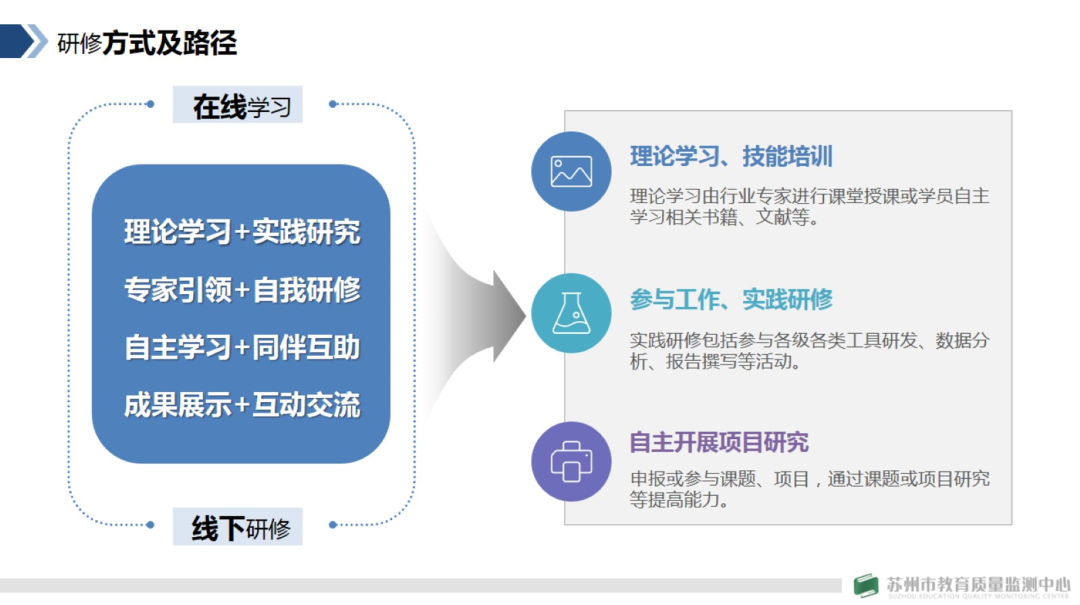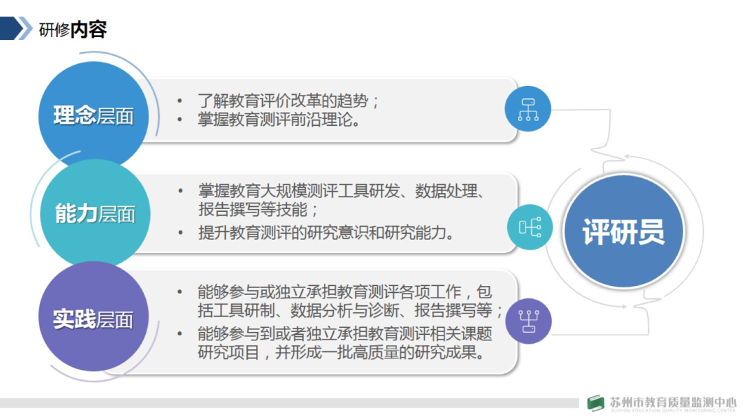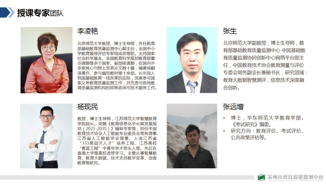 她强调,本次高研班我们高度重视,监测中心精心设计了一套高起点、高标准、严要求的培训方案。首先,对参研人员的精挑细选,监测中心从具有大市或区县级学科带头人中选拔出42名优秀学员,作为首届学员。其次,对培训专家和培训课程的精心筛选,监测中心从教育部基础教育质量监测中心、北京师范大学、华东师范大学等全国知名高校,邀请教育测评领域的顶级专家为我们带来国内外最前沿的研究理论和实践案例。第三,对培训模式的精心设计,如设置了丰富多样的培训内容,线上线下相有机结合的培训方式,严格的考核机制等等。