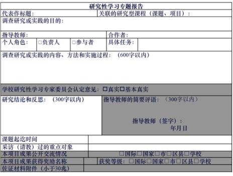 这一部分包括:研究性学习专题报告,(市级)科技活动项目,创造发明项目和专利类型,参加市级青少年科学研究院名称。 研究性学习专题报告主要反映学生的调查研究能力、动手操作能力和实践体验经历,请学生从各类研究活动经历中选择一个最具代表性的调查研究课题或实践项目,对调查研究或实践的目的、内容、方法、实施过程、结论和反思进行描述。