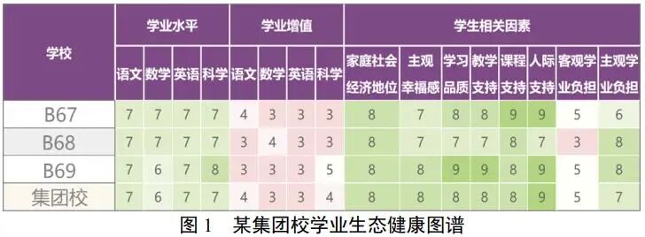 在对集团校监测数据的分析中,我们发现,部分集团校内部学生的学业发展不均衡,且学生学业相关因素的差异也较大。以图1为例,呈现了某集团校学业生态健康图谱,从集团校的整体情况来看,本集团整体学业成绩较好,学生相关因素较好,但学业增值情况不佳。从集团内各成员校的情况来看,B69学校各科学业水平存在差异,主观幸福感、学习品质、教学支持三项指标相较其他学校较为突出;B68学校各科学业水平较为均衡,学习品质、教学支持和人际支持情况相较其他学校较弱,客观学业负担较重;B67整体相对均衡。