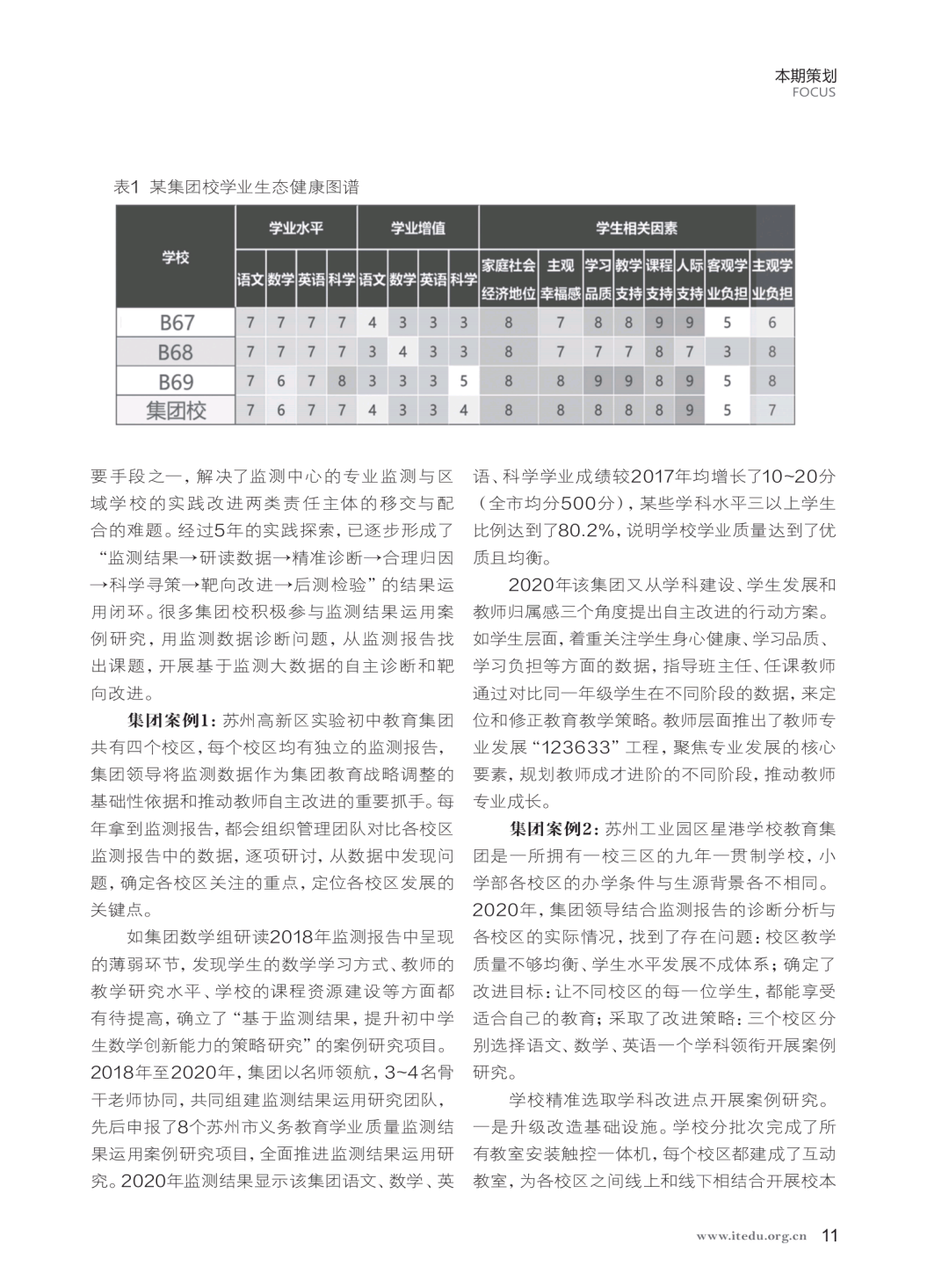 集团案例1:苏州高新区实验初中教育集团共有四个校区, 每个校区均有独立的监测报告,集团领导将监测数据作为集团教育战略调整的基础性依据和推动教师自主改进的重要抓手。每年拿到监测报告,都会组织管理团队对比各校区监测报告中的数据, 逐项研讨,从数据中发现问题,确定各校区关注的重点, 定位各校区发展的关键点。