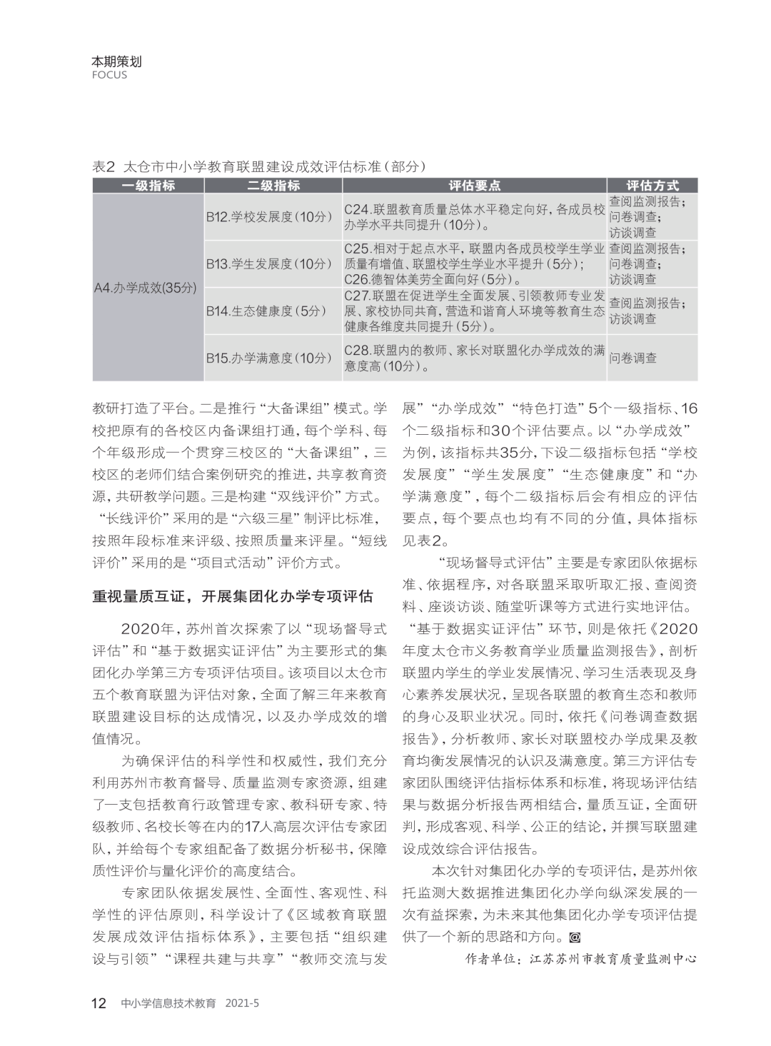 【摘 要】苏州依托监测大数据,构建集团校学业质量常模,实现对集团校的精准诊断,并以案例研究为抓手,引导集团校开展自主诊断和靶向改进, 全面助力集团化办学提质增效。2020年首次探索针对集团化办学的专项评估项目,以“现场督导式评估”和“基于数据实证评估”相结合的形式,为集团化办学持续高效运行创新赋能,推进集团化办学向纵深发展。