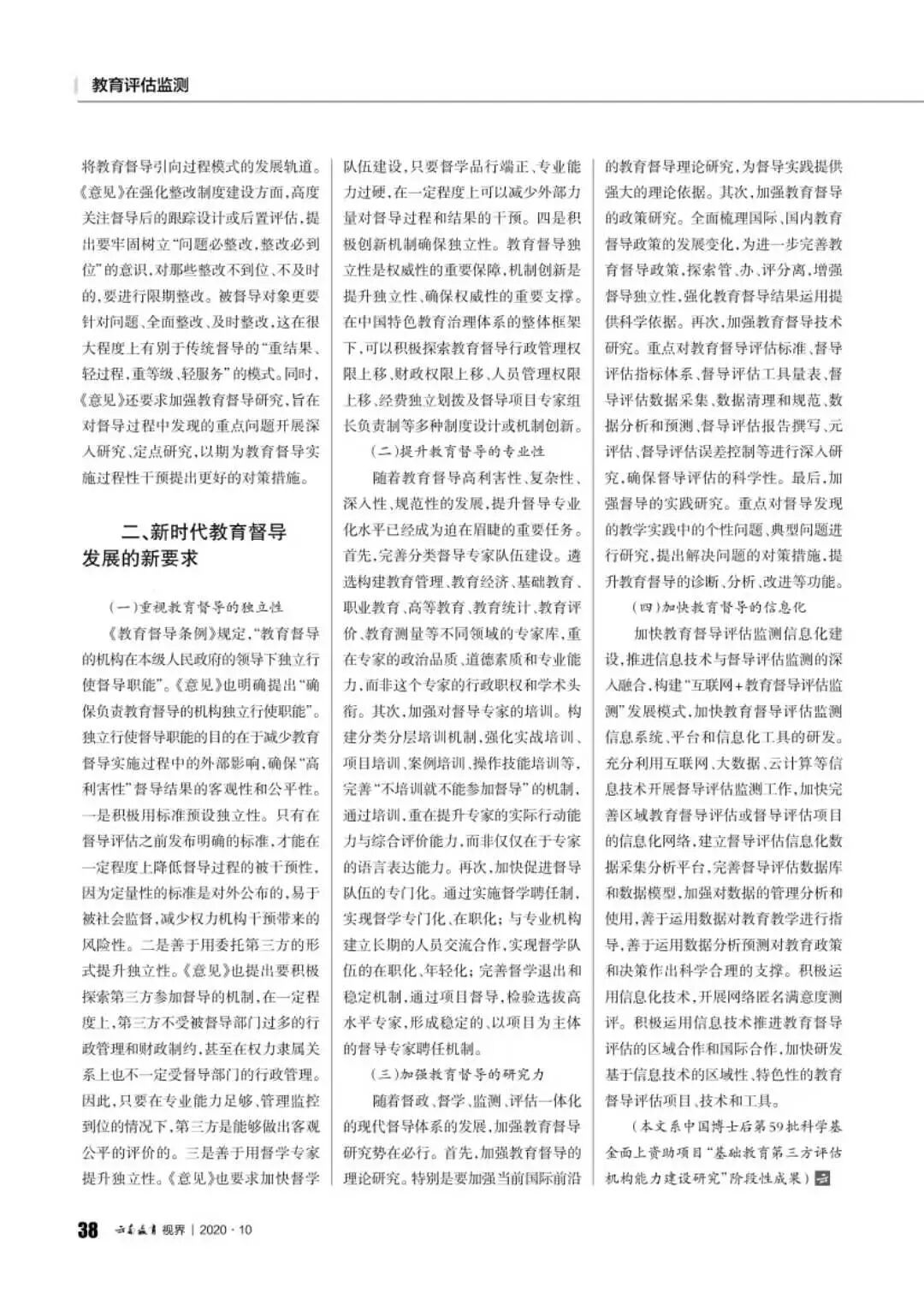2020年2月14日,中共中央办公厅、国务院办公厅印发了《关于深化新时代教育督导体制机制改革的意见》(以下简称《意见》)。这是党中央、国务院在新时代背景下深化教育督导改革的重大部署,构建了中国特色教育督导的制度框架,创新了教育督导工作的实践路径,明确了教育督导发展的新任务和新要求,对加快推动我国教育治理体系和治理能力现代化具有重要的现实意义。