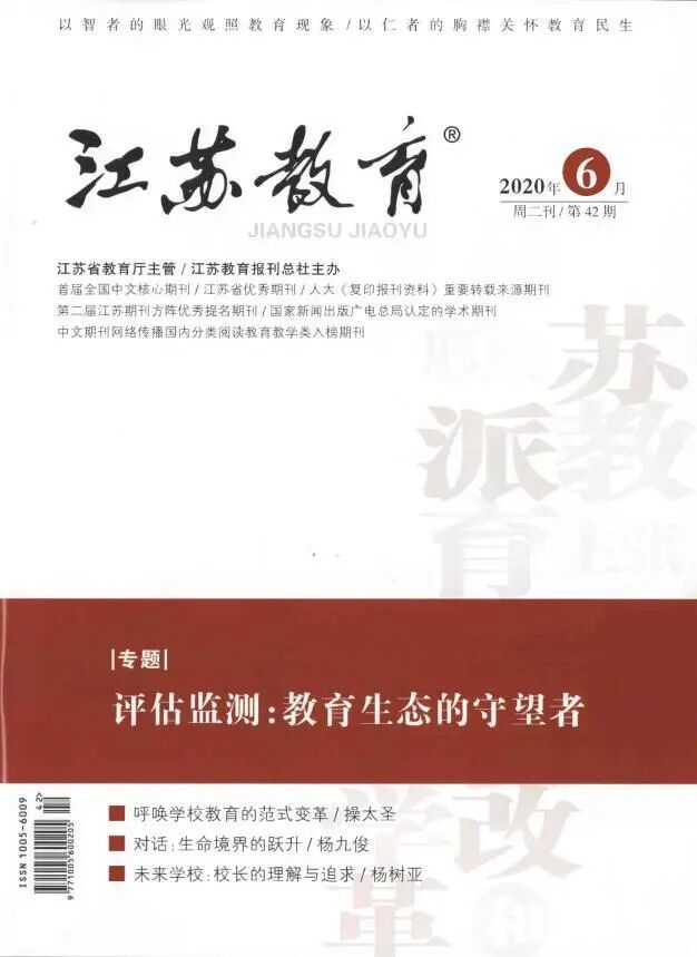 2020年6月,《江苏教育·教育管理》以专题形式刊载了6篇教育评估监测论文。6篇论文的作者均是教育监测专家、从业人员和一线教师等,他们通过论文来分享他们的理论研究成果、实践探索和观点主张,以期引发大家对“教育评估监测”的深入关注和讨论,为区域教育质量监测工作提供样本参考。教育部基础教育质量监测中心副主任王耘教授以《区域教育质量监测与结果应用的探索者》为题作了专业的点评。