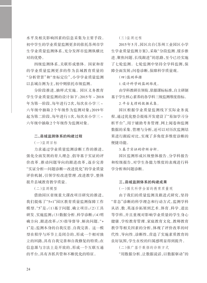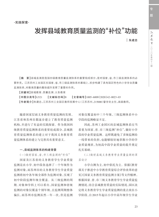 随着国家层面义务教育质量监测的发展,江苏省和苏州市都逐步建立了教育质量监测机构,并进行了有益的实践探索。作为我国四级教育质量监测体系的重要组成部分,县域教育质量监测体系的建立对于我国义务教育质量监测体系的建立与完善具有重要意义。