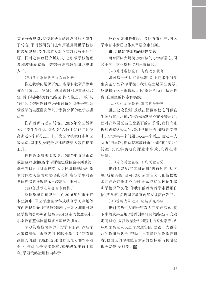 苏州工业园区的县域监测体系应当着重为国家、省、市三级监测“补位”,做好小学段的学业质量监测。这样既避免了多级监测给一线带来的负担,也能够较好地掌握小学的学业质量现状,为初高中段学业质量的提升奠定扎实基础。(完整内容见下图)