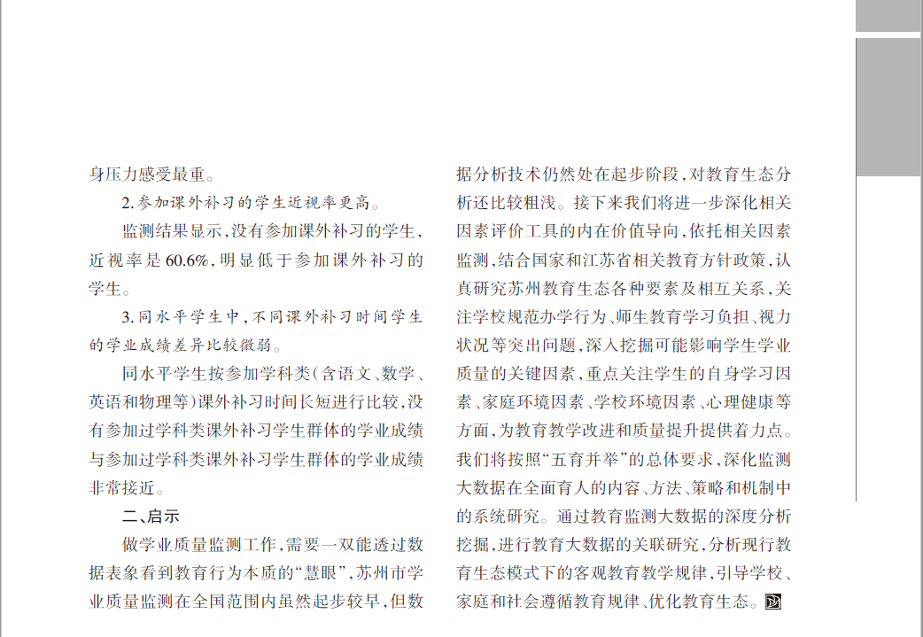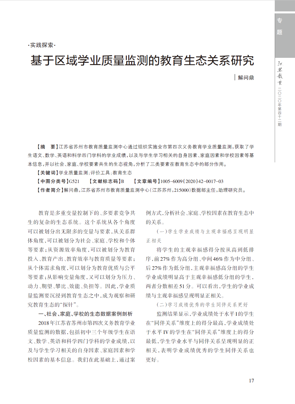 2020年6月,《江苏教育·教育管理》以专题形式刊载了6篇教育评估监测论文。6篇论文的作者均是教育监测专家、从业人员和一线教师等,他们通过论文来分享他们的理论研究成果、实践探索和观点主张,以期引发大家对“教育评估监测”的深入关注和讨论,为区域教育质量监测工作提供样本参考。教育部基础教育质量监测中心副主任王耘教授以《区域教育质量监测与结果应用的探索者》为题作了专业的点评。