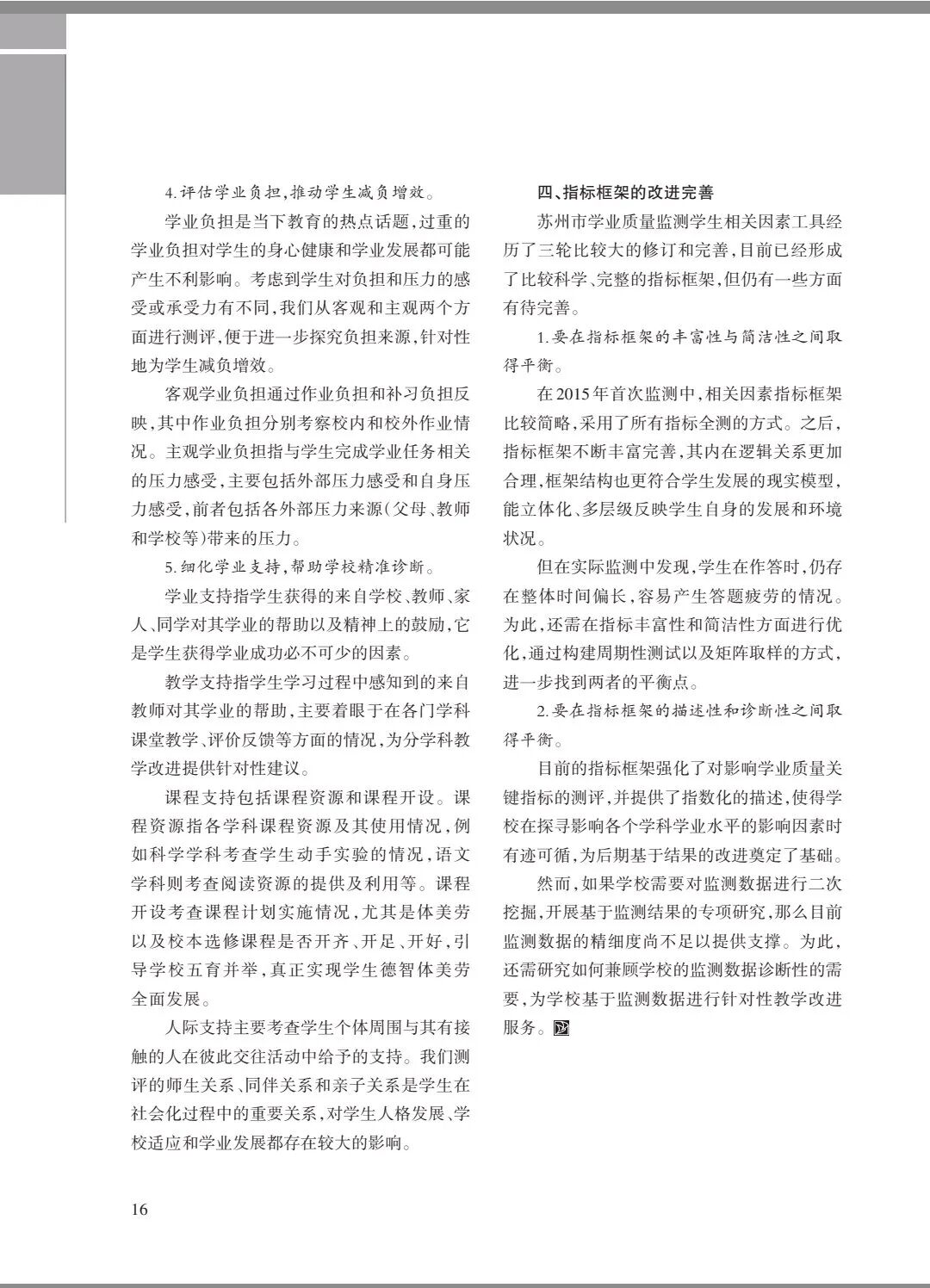 苏州市学业质量监测学生相关因素工具经历了三轮比较大的修订和完善,目前已经形成了比较科学、完整的指标框架,但仍有一些方面有待完善。