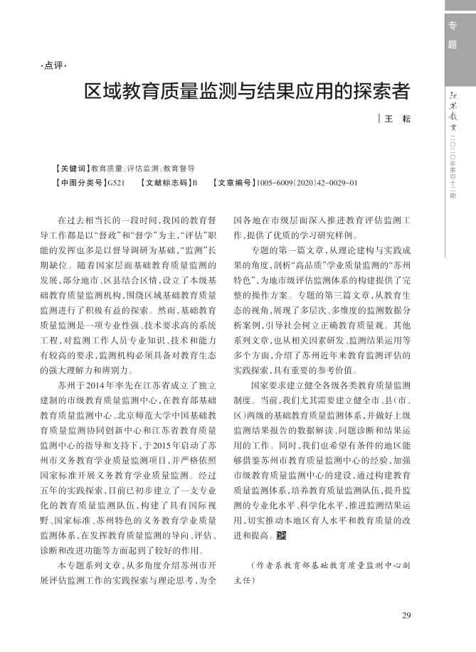 2020年6月,《江苏教育·教育管理》以专题形式刊载了6篇教育评估监测论文。6篇论文的作者均是教育监测专家、从业人员和一线教师等,他们通过论文来分享他们的理论研究成果、实践探索和观点主张,以期引发大家对“教育评估监测”的深入关注和讨论,为区域教育质量监测工作提供样本参考。教育部基础教育质量监测中心副主任王耘教授以《区域教育质量监测与结果应用的探索者》为题作了专业的点评。