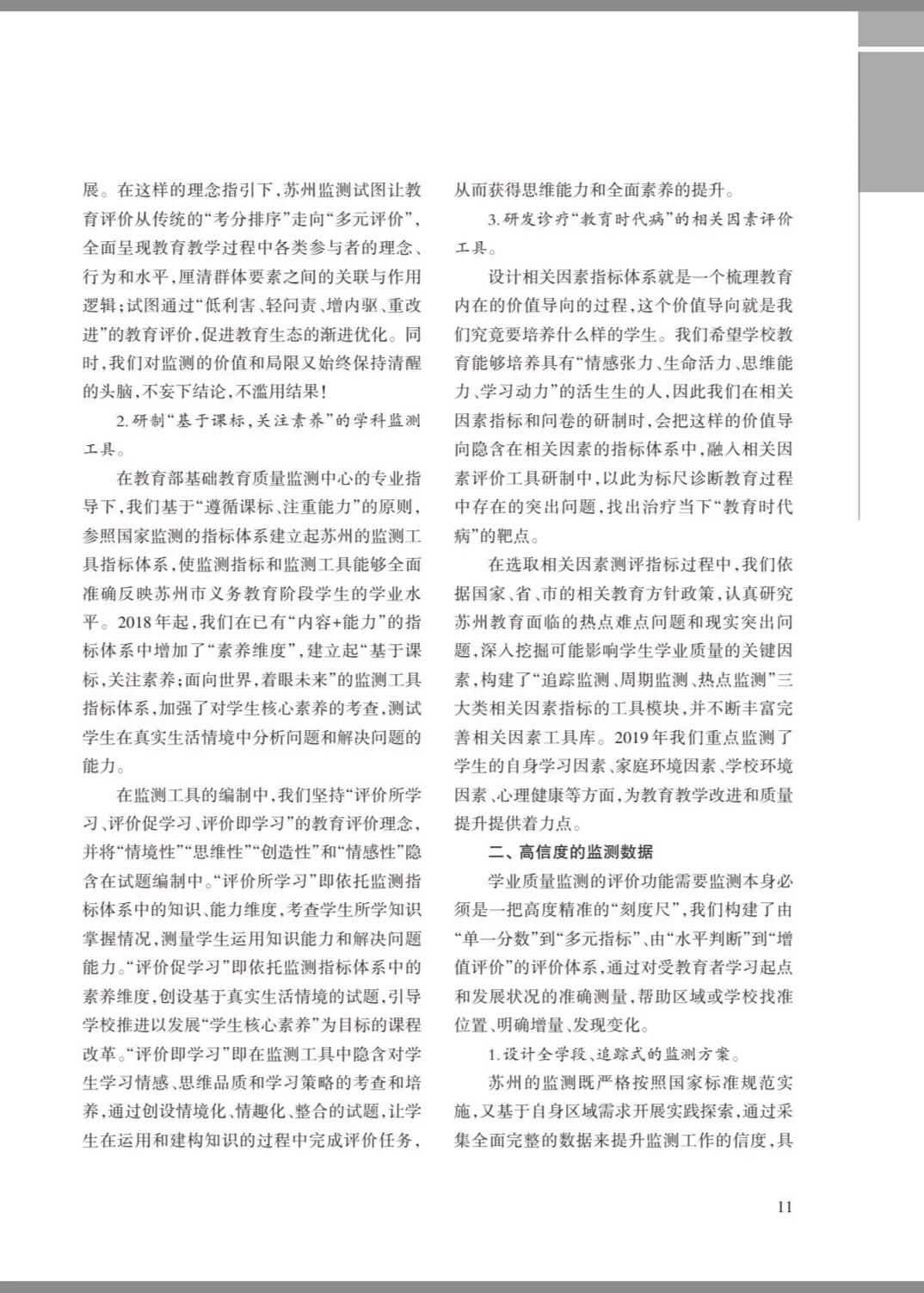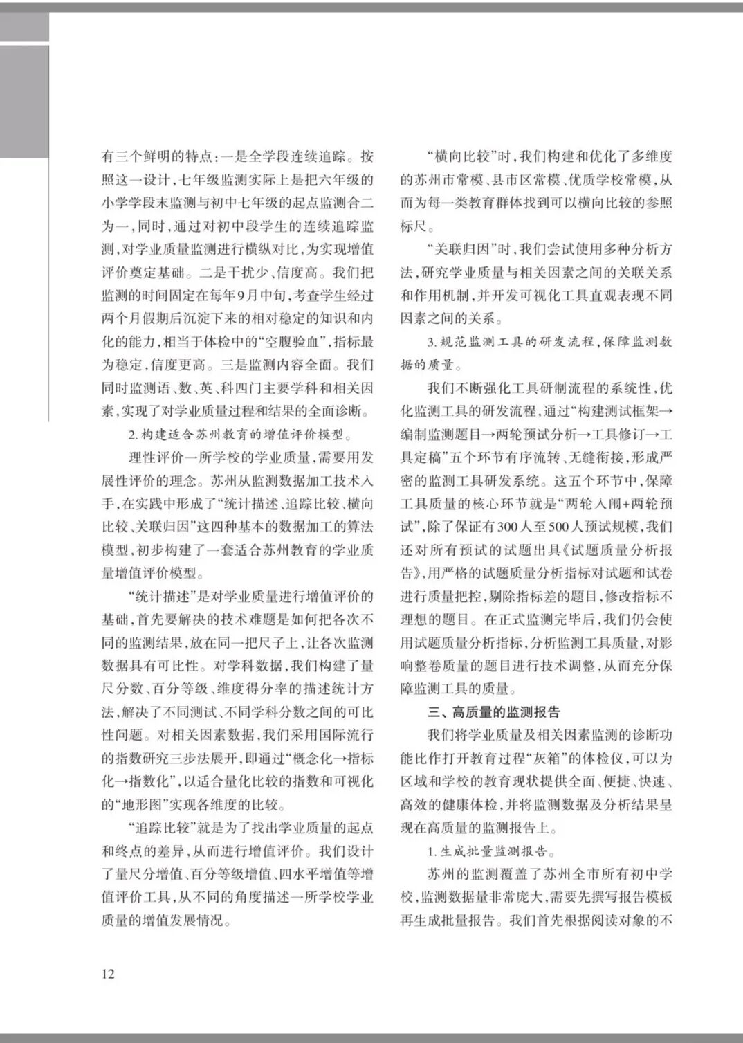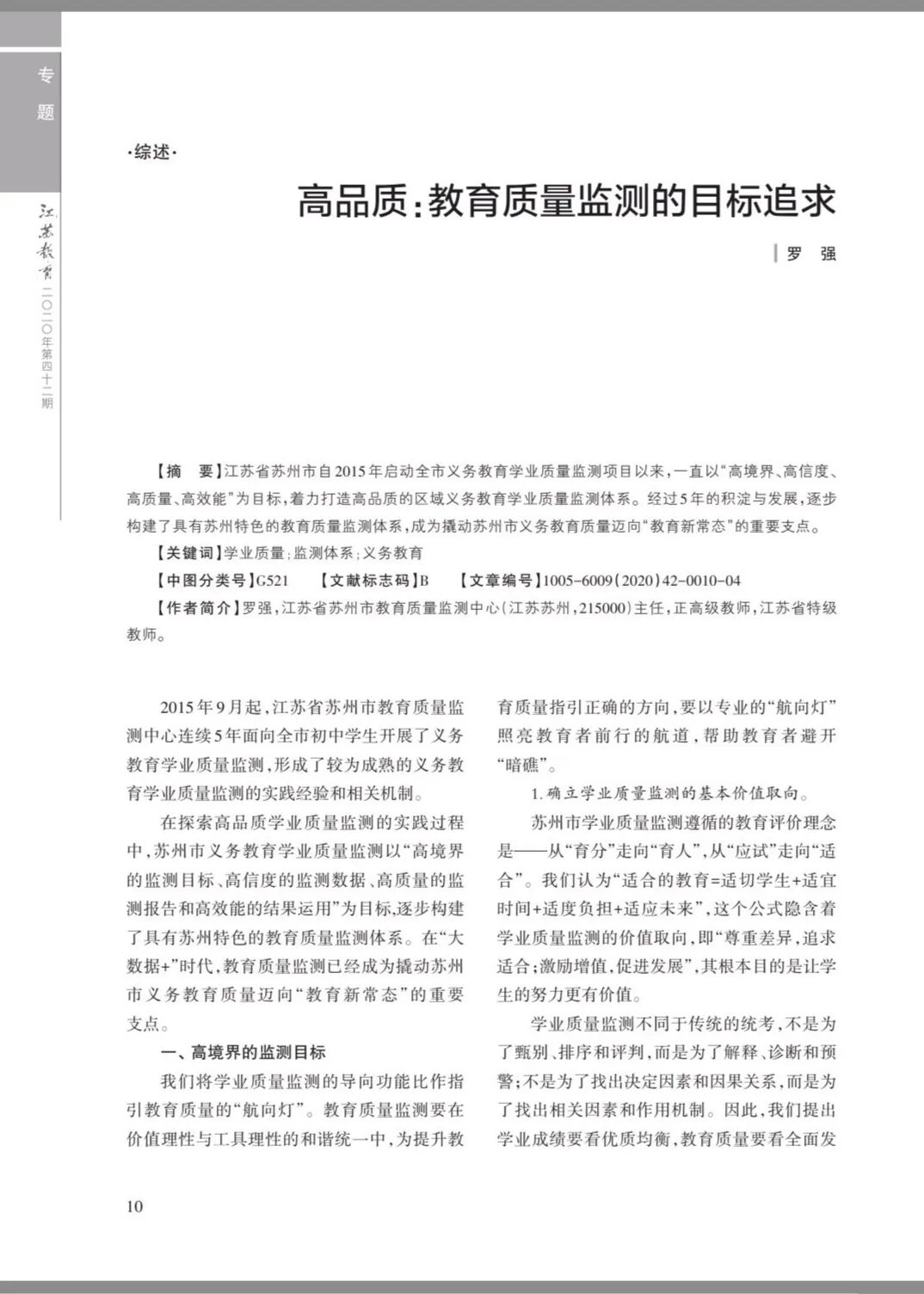 2020年6月,《江苏教育·教育管理》以专题形式刊载了7篇教育评估监测论文。7篇论文的作者均是教育监测专家、从业人员和一线教师等,他们通过论文来分享他们的理论研究成果、实践探索和观点主张,以期引发大家对“教育评估监测”的深入关注和讨论,为区域教育质量监测工作提供样本参考。