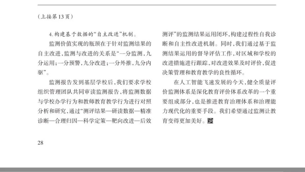 在人工智能飞速发展的今天,健全质量评价监测体系是深化教育评价体系改革的一个重要组成部分,也是推进教育治理体系和治理能力现代化的重要手段。我们希望通过监测让教育变得更加美好。(完整内容见下图)