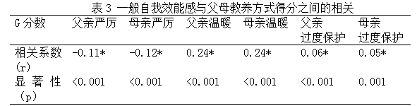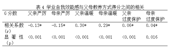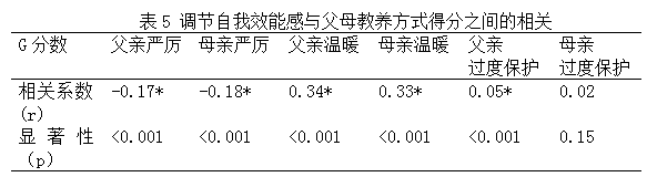 为了探究一般自我效能感(G分数)与父母教养方式各维度之间的关系,分别做了六次Kendall's tau-b相关(非参数检验),结果显示六个维度得分与G分数均相关显著。具体相关系数及显著性指标p值参见表3。