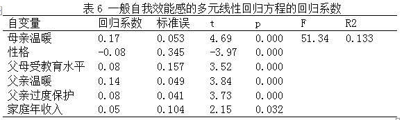 (四)自我效能感与父母教养方式等因素的多元线性回归