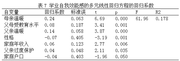 将S分数作为因变量,将父母教养方式各因子以及其它对S分数有影响的人口学变量作为自变量。采用逐步回归法筛选学业自我效能感影响因素,筛选标准a=0.05。最终进入方程的变量有:母亲温暖、父亲温暖、父亲过度保护、性格、父母受教育水平和家庭年收入和家庭户口七个变量。具体参见表7。