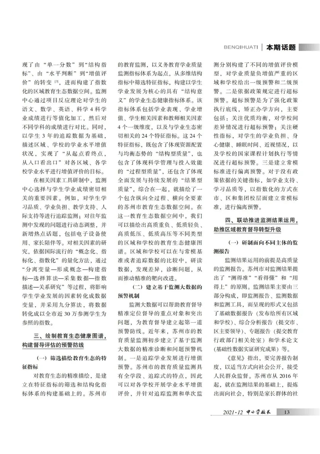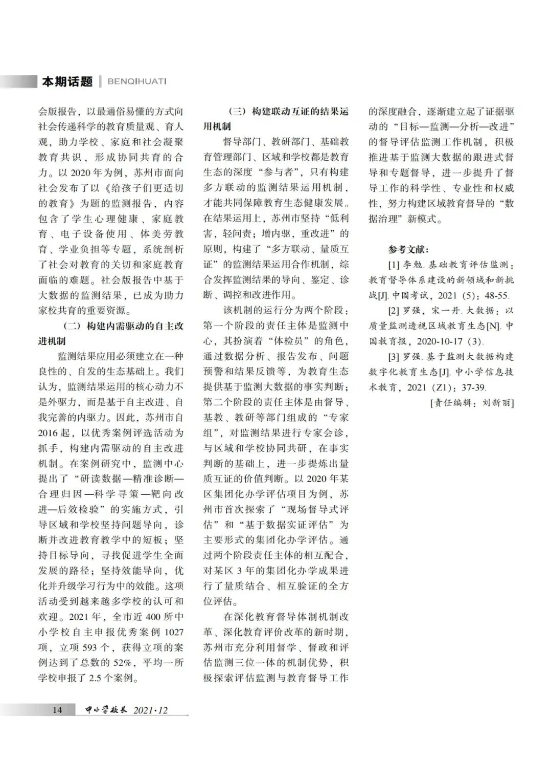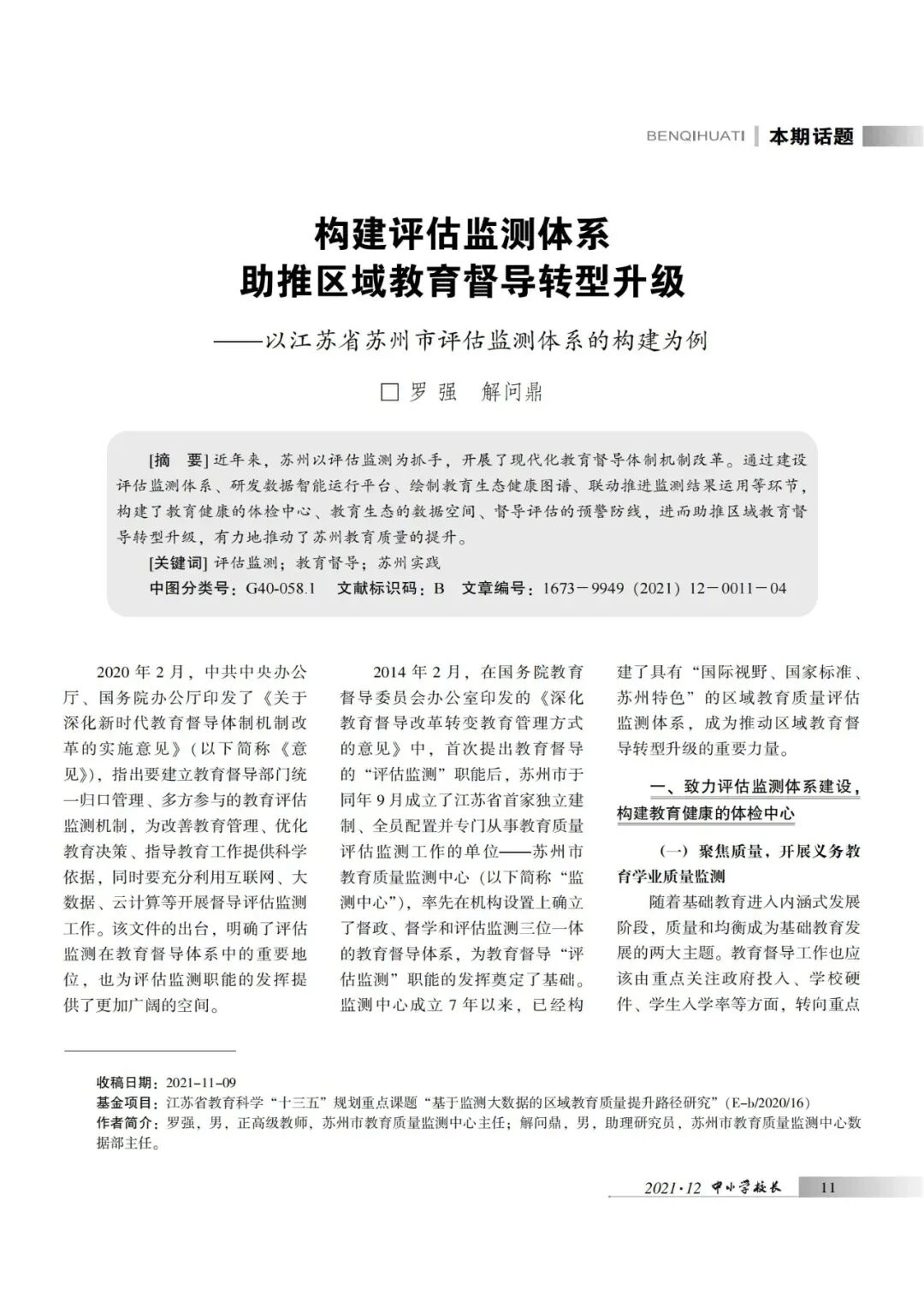 20 22 新年快乐! 第一作者:罗强 苏州市教育质量监测中心主任 第二作者:解问鼎 苏州市教育质量监测中心数据部主任 摘要✦ 近年来,苏州以评估监测为抓手,开展了现代化教育督导体制机制改革。通过建设评估监测体系、研发数据智能运行平台、绘制教育生态健康图谱、联动推进监测结果运用等环节,构建了教育健康的体检中心、教育生态的数据空间、督导评估的预警防线,进而助推区域教育督导转型升级,有力地推动了苏州教育质量的提升。 2020年2月,中共中央办公厅、国务院办公厅印发了《关于深化新时代教育督导体制机制改革的实施意见》(以下简称《意见》),指出要建立教育督导部门统一归口管理、多方参与的教育评估监测机制,为改善教育管理、优化教育决策、指导教育工作提供科学依据,同时要充分利用互联网、大数据、云计算等开展督导评估监测工作。该文件的出台,明确了评估监测在教育督导体系中的重要地位,也为评估监测职能的发挥提供了更加广阔的空间。 2014年2月,在国务院教育督导委员会办公室印发的《深化教育督导改革转变教育管理方式的意见》中,首次提出教育督导的“评估监测”职能后,苏州市于同年9月成立了江苏省首家独立建制、全员配置并专门从事教育质量评估监测工作的单位——苏州市教育质量监测中心(以下简称“监测中心”),率先在机构设置上确立了督政、督学和评估监测三位一体的教育督导体系,为教育督导“评估监测”职能的发挥奠定了基础。监测中心成立7年以来,已经构建了具有“国际视野、国家标准、苏州特色”的区域教育质量评估监测体系,成为推动区域教育督导转型升级的重要力量。 一、致力评估监测体系建设,构建教育健康的体检中心 聚焦质量,开展义务教育学业质量监测 随着基础教育进入内涵式发展阶段,质量和均衡成为基础教育发展的两大主题。教育督导工作也应该由重点关注政府投入、学校硬件、学生入学率等方面,转向重点关注教育质量。[1]2015年,苏州市正式启动“苏州市义务教育学业质量监测项目”,在每年9月开学的第二周,对全市初中学生开展学业质量“空腹”体检。监测内容包括语文、数学、英语和科学四门学科,以及学生、教师相关因素三个部分。同时,通过由初一学生倒追至小学六年级学生的方式,呈现全市各小学的学业质量发展状况。 以2020年为例,监测中心历时7个月研制监测工具28套,采用“学校全覆盖、学生全参与、学科等比例抽样、相关因素全测”的方式,实现了对全市277所初中的28.7万学生和1.6万教师的学业质量监测,并通过数据倒追的方式,获得了487所小学六年级毕业生的学业质量监测结果。监测中心把这个项目看作区域教育健康体检的“超大型CT”。通过对小学、初中校全覆盖的学业质量监测,全面测量、描绘并把脉苏州教育生态的健康状况[2],从而将教育生态健康的诊断、预警防线建立到基层每一所学校。该项目已经连续实施6年,采集了多维的、海量的、高质量的、结构化且相互关联紧密的监测大数据,并且通过监测大数据,将教育督导的关注领域拓展至学生全面发展、教师专业发展和教育教学管理等方面。 对标教育政策,开展各级各类专项评估监测 《意见》指出,要全面落实教育督导职能,确保党和国家的教育方针政策落地生根。这意味着,教育督导在督促落实教育法律法规和教育方针政策、规范办学行为等方面必须发挥重要的作用。为此,苏州市监测中心以评估监测为抓手,通过专项评估监测的形式定期或不定期对国家的教育方针政策、办学行为以及当前义务教育面临的重点、难点问题进行监测。专题式、跟进式的专项评估监测,已成为苏州市义务教育学业质量监测体系的有效补充。 2019年,苏州市开展了“电子设备”“近视”“体美劳教育”“心理健康”“教师职业状态”等方面的专项评估监测,及时对标相关政策文件要求,发现存在的问题与不足,并为教育行政部门提供评估监测报告或决策咨询报告。2020年,“五项管理”文件一经出台,苏州市立即依托前期已经采集的监测数据撰写了《“五项管理”监测专题分析报告》,系统分析了苏州市各区“五项管理”的落实情况以及存在的问题,监测中心还将配合督学深入学校,进一步开展量质互证的“五项管理”专项评估监测。 二、研发数据智能运行平台,构建教育生态的数据空间 研发智能化的监测大数据加工平台 教育督导和大数据的融合是必然趋势,也是教育领域综合改革的必然要求。监测中心致力于智能化的监测大数据加工平台建设。一方面,积极推进大数据处理与分析的标准化、自动化和智能化。在多年的学业质量监测数据分析的实践基础上,通过将评估监测各环节的数据处理流程不断标准化,将算法和运行程序固化成软件模块,初步实现了数据处理全过程链的标准化和自动化。以2020年为例,从监测实施到3500多份数据报告的生成,仅用了两个多月的时间,极大地缩短了监测结果的反馈时间。另一方面,不断迭代升级监测大数据可视化系统。监测中心设计了百分等级圆点图、相关因素海平面图、学业生态健康指数图谱等多种图表,实现了对所有呈现数据“一表一图”的可视化表达。监测中心还开发了面向区域管理者的监测大数据可视化平台,可以通过线上线下相结合的方式,为区域教育提
